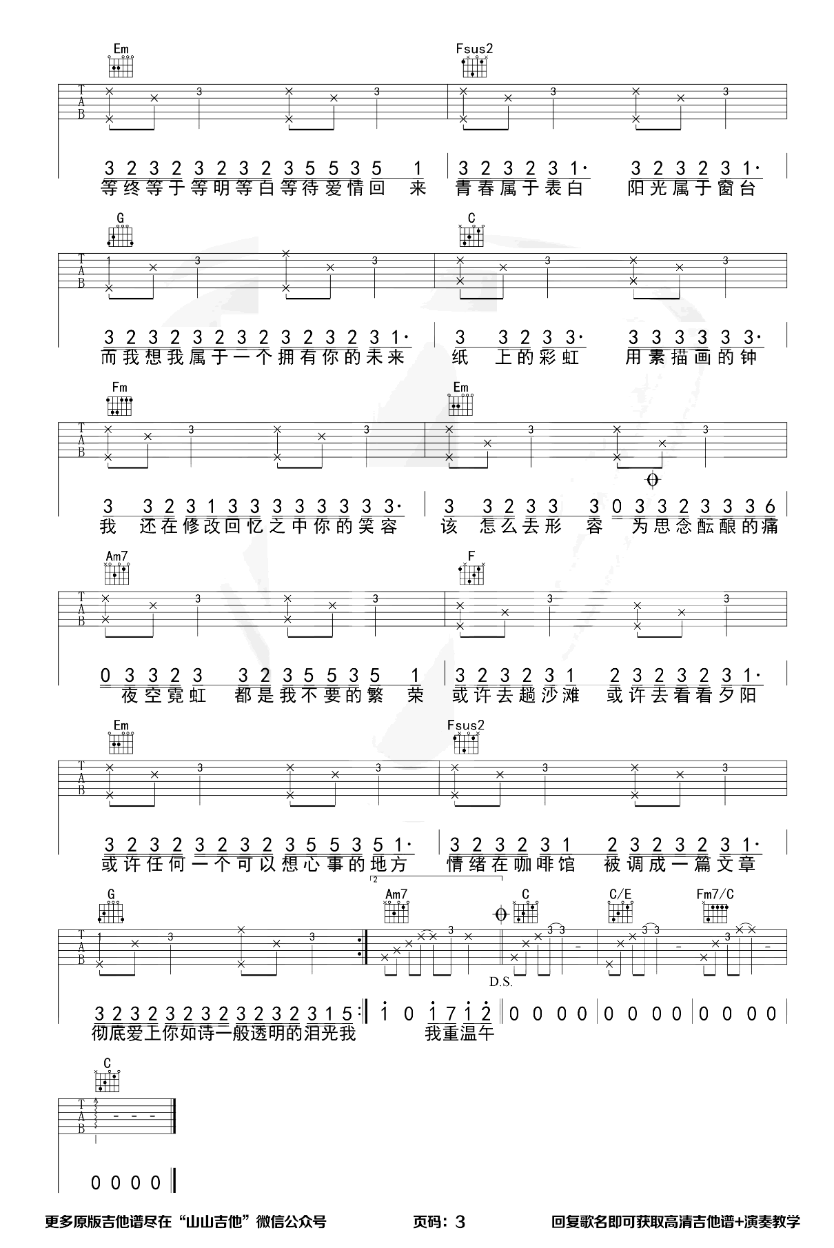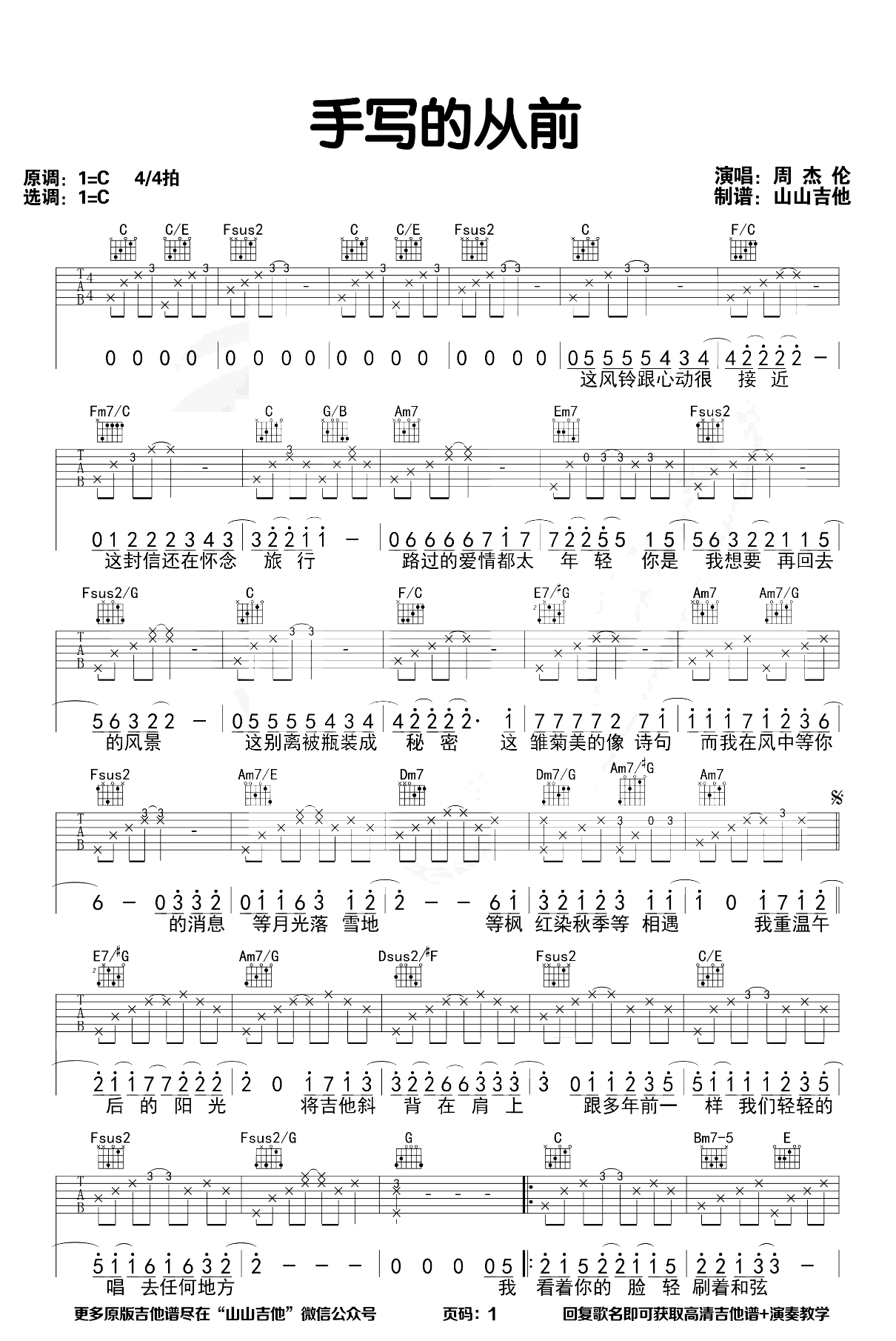 曲谱介绍: 周杰伦的一首特别好听的歌曲,手写的从前吉他谱,选用原调C调编配,四四拍,共三张图片六线谱。原版吉他谱配套《手写的从前》吉他弹唱演示和教学视频,由山山老师编配分享。 整首歌曲变化比较丰富,吉他弹奏部分稍微有些难度,和弦方面需要大家多多练习。