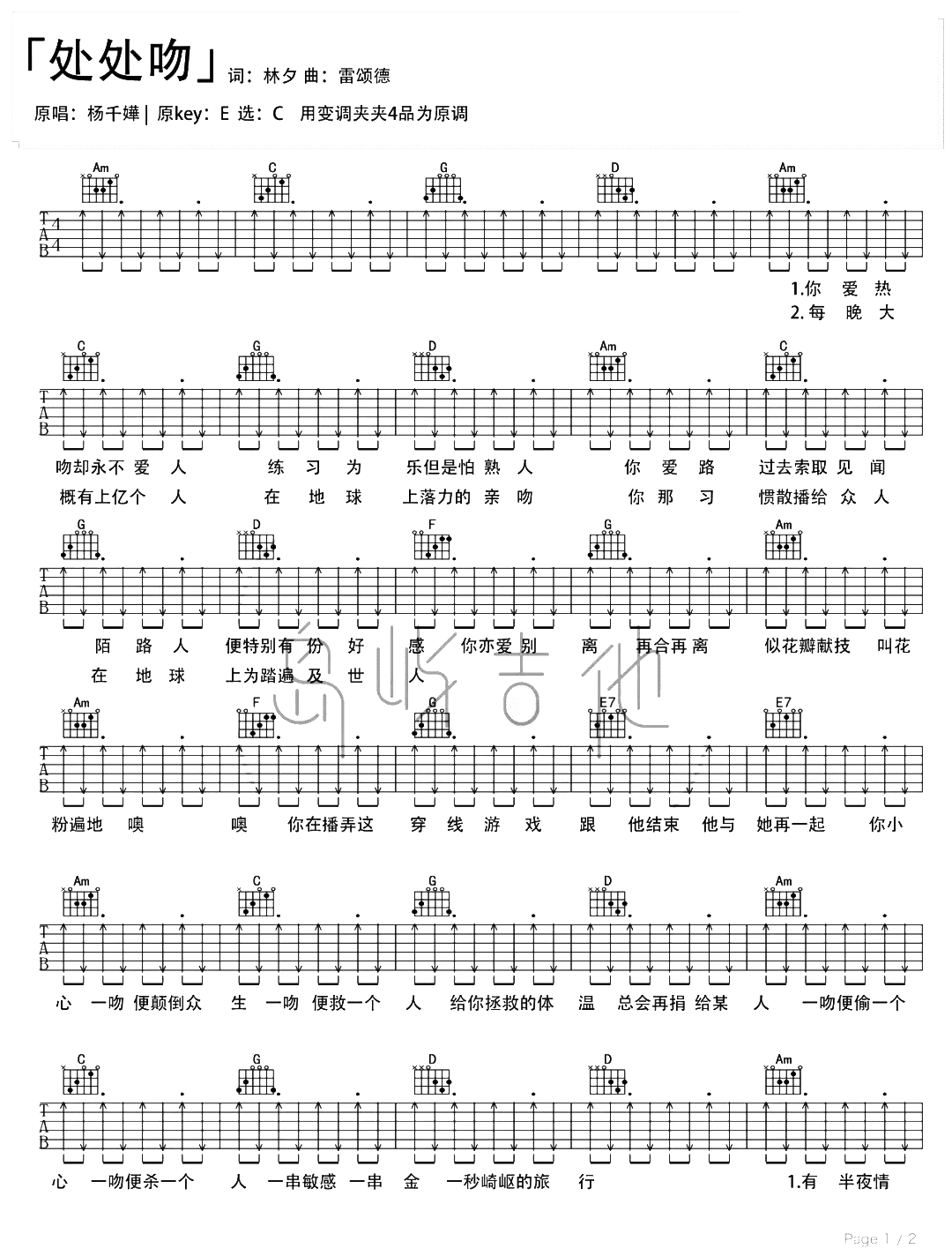 曲谱介绍: 杨千嬅《处处吻》吉他谱,共有两张高清图片谱例,由岛屿吉他制谱,选用C调指法,建议变调夹4品弹唱,主要以扫弦节奏为主,中间用到了制音技巧,随谱《处处吻》吉他弹唱教学,弹唱时候可以参考练习。
