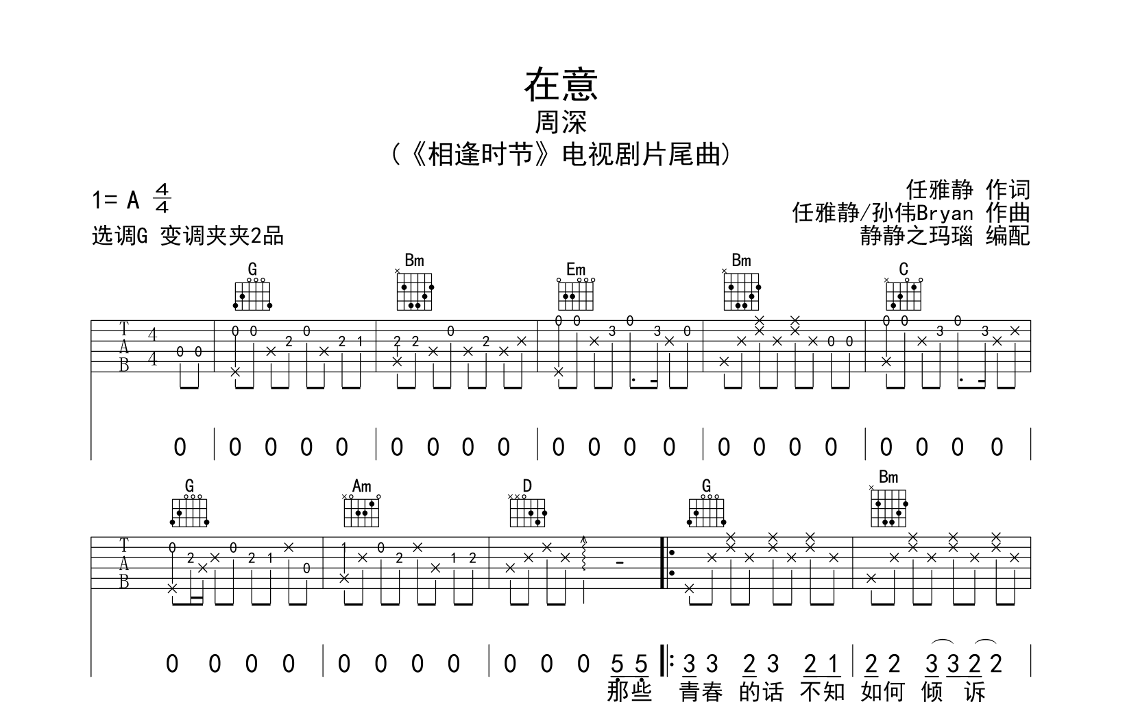 曲谱介绍: 在意吉他谱,周深演唱,由创作者@静静之玛瑙制谱,本谱采用G调和弦指法编配,节奏为4/4拍,速度为75拍每分钟,弹唱建议变调夹夹2品,难度初级。