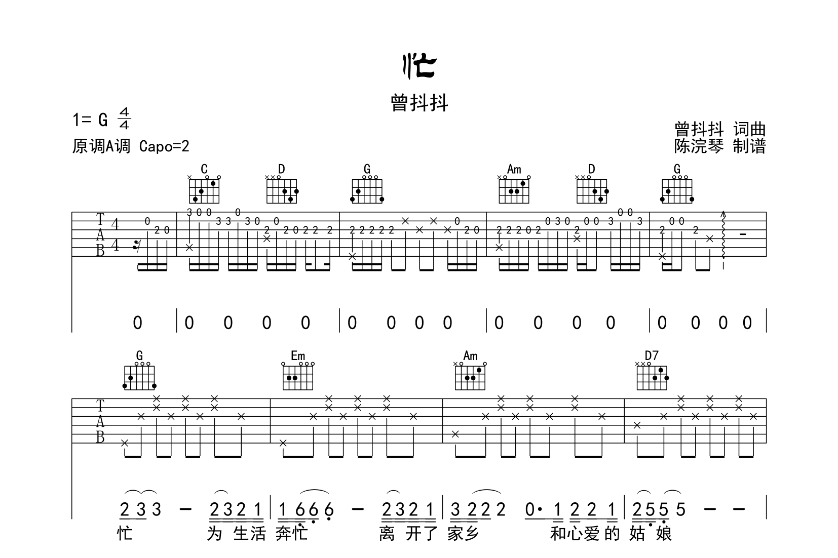 忙吉他谱 - 曾抖抖 - A调吉他弹唱谱 - 原版