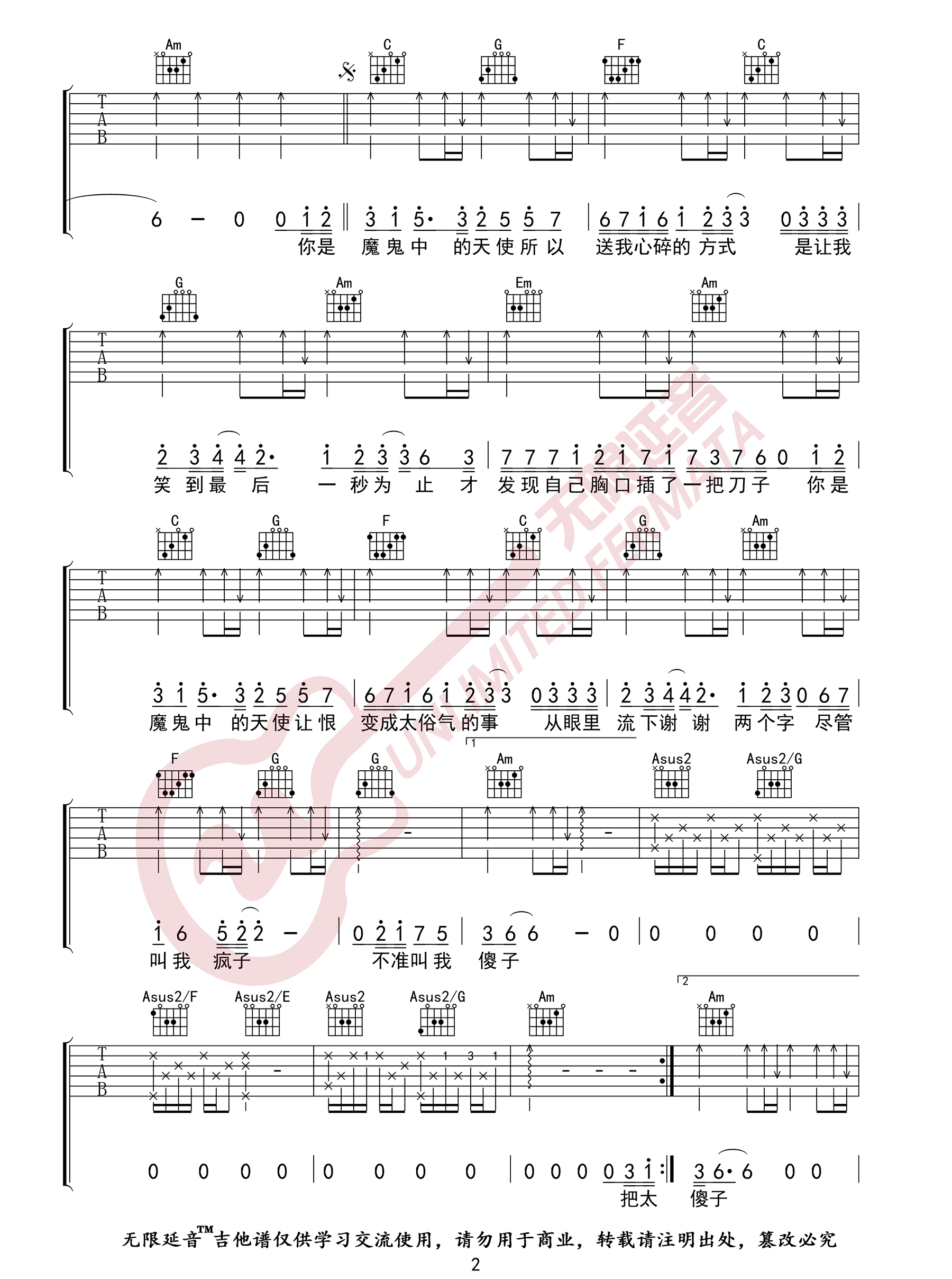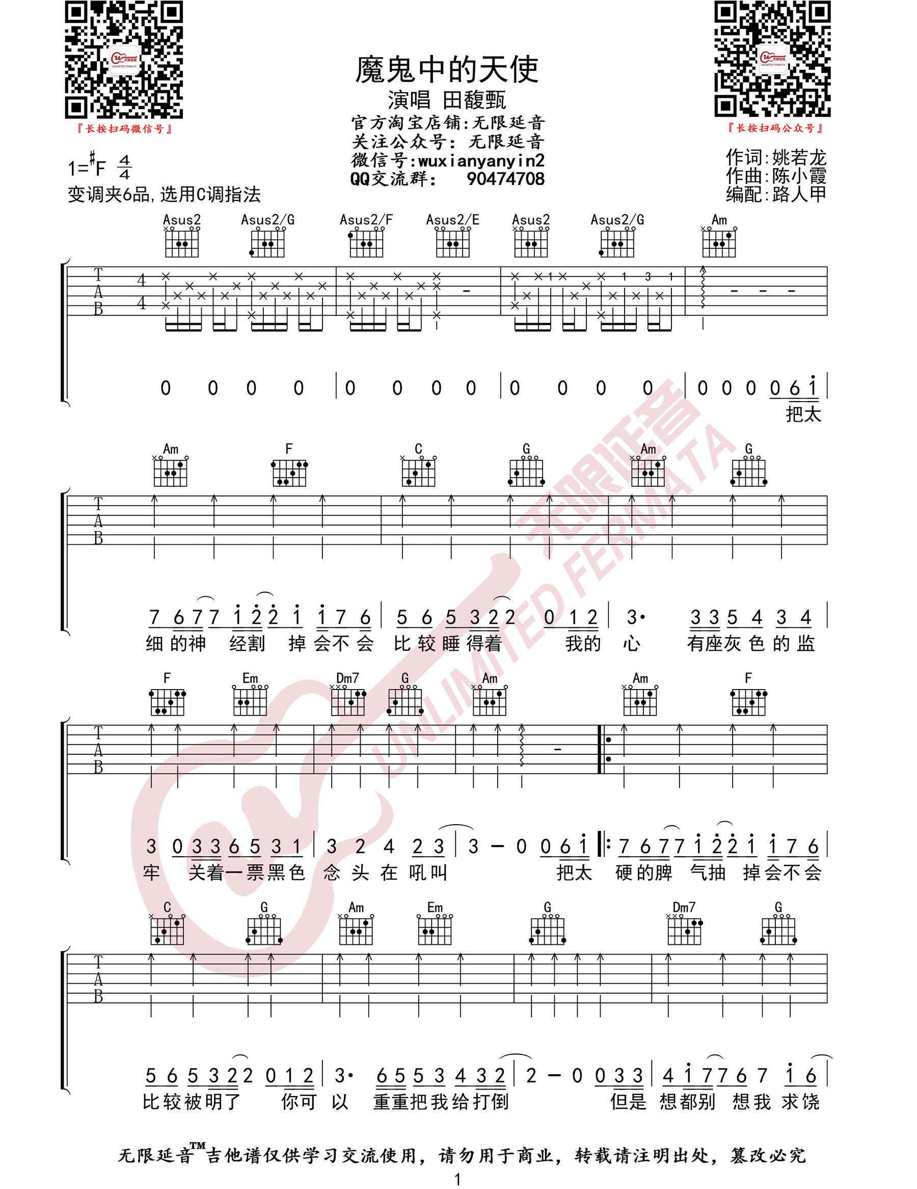 曲谱介绍: 《魔鬼中的天使》吉他谱_田馥甄_C调原版弹唱六线谱_高清图片谱1: