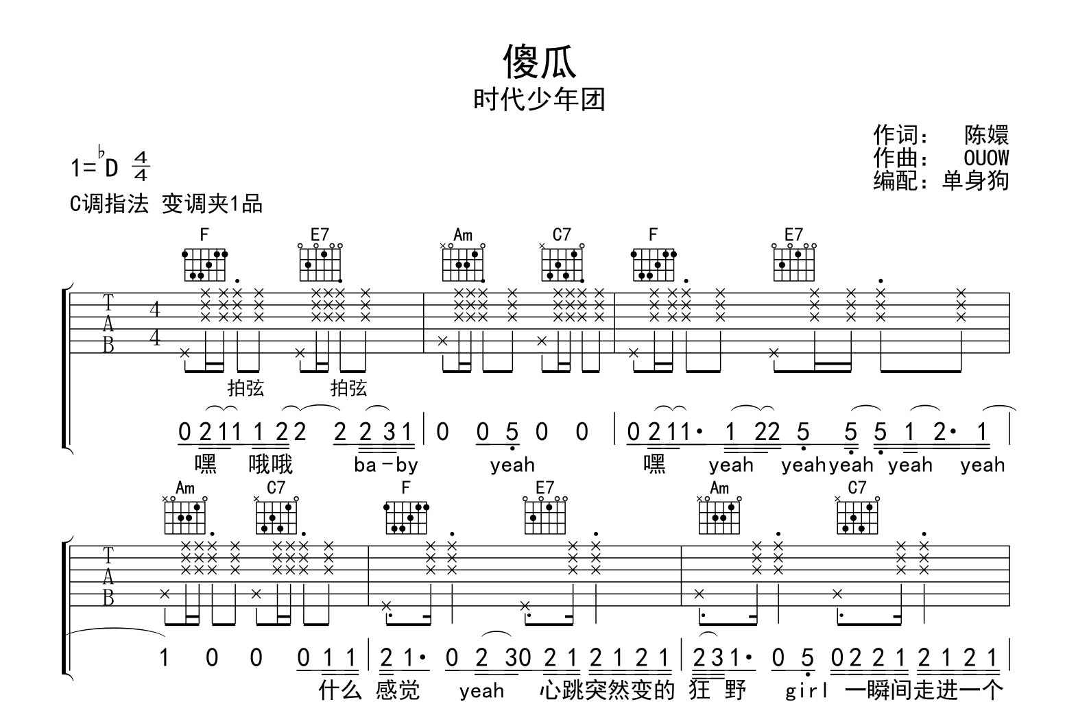 曲谱介绍: 时代少年团《傻瓜》吉他谱,由创作者@单身狗制谱,共四张高清图片谱例,选用C调指法,变调夹可夹一品弹唱原调#C,难度初级简单。