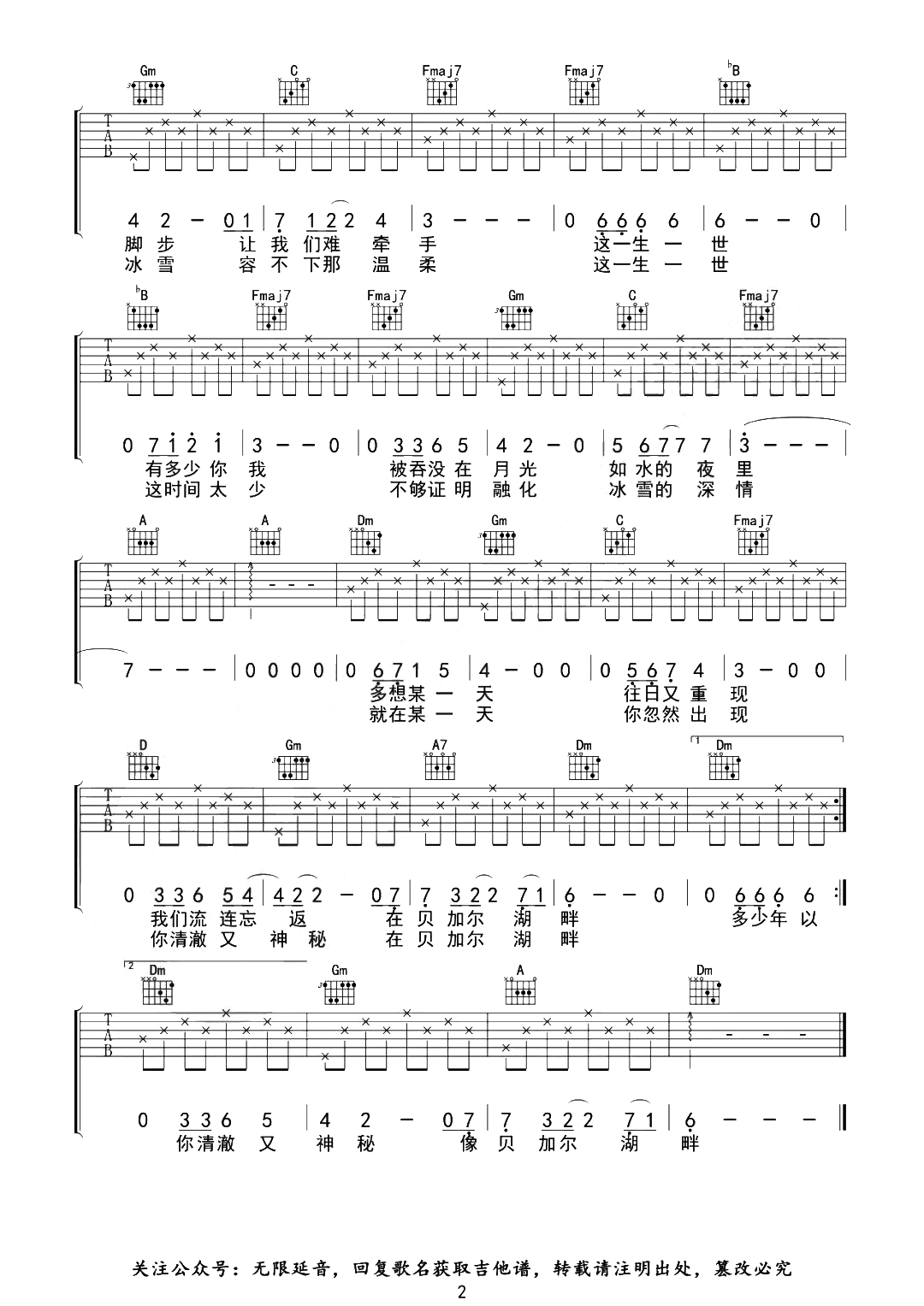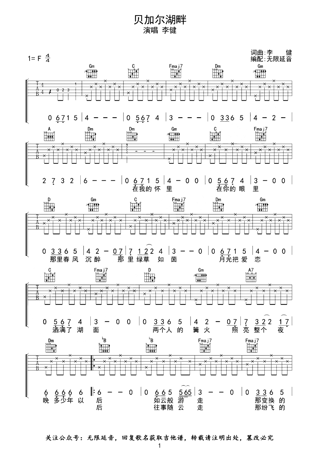 曲谱介绍: 李健《贝加尔湖畔》吉他谱,由无限延音制谱,选用F调,《贝加尔湖畔》吉他弹唱谱,共两张高清图片谱,版本完整含标准前奏,分解和弦弹唱全曲,难度初级简单。
