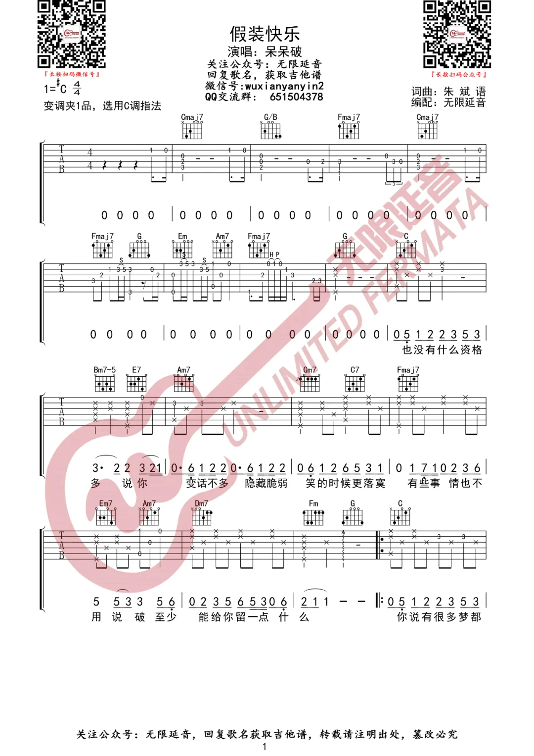 假装快乐吉他谱 - 呆呆破 - C调吉他弹唱谱 - 原版
