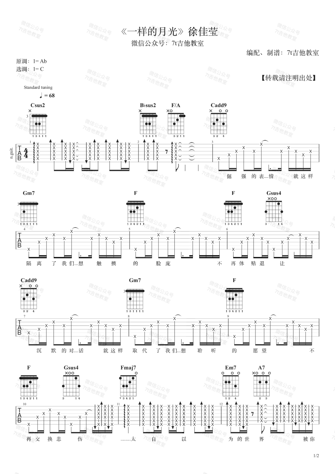 曲谱介绍: 徐佳莹《一样的月光》吉他弹唱谱,采用C调指法编配,共有2张高清图谱,免翻页排版设计。