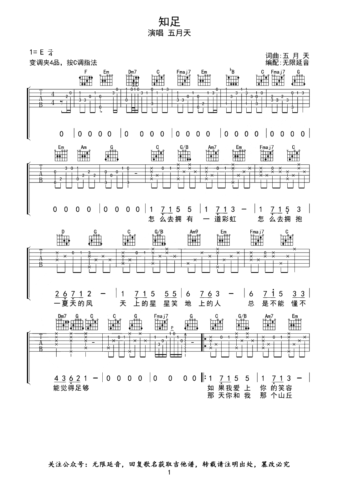 曲谱介绍: 知足吉他谱,五月天演唱,由无限延音制谱分享,共有两张高清图片谱,选用C调指法,建议变调夹4品弹唱原调E调,节奏4/4拍,高还原度前奏按原版精编,难度初级简单。