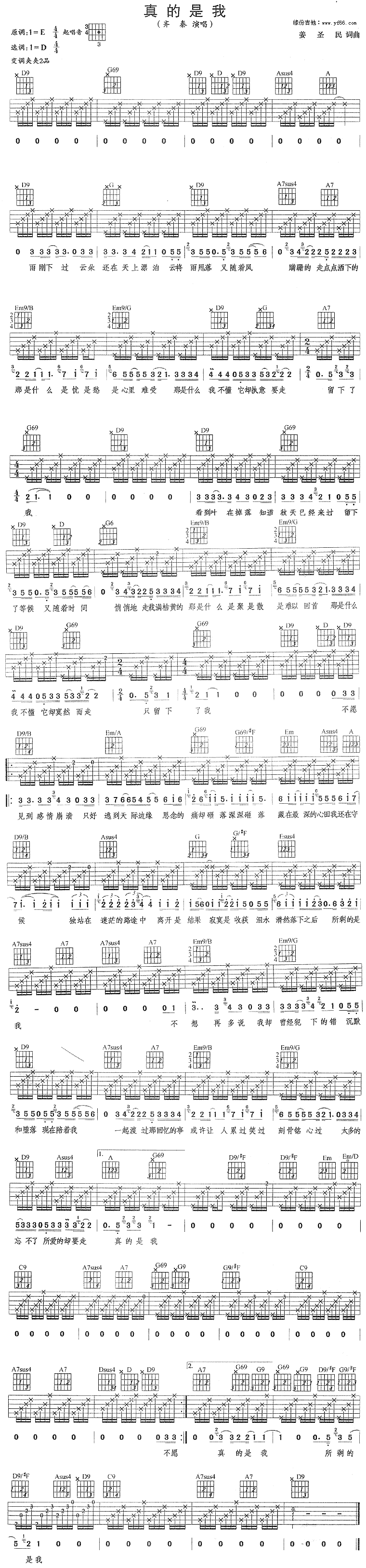 曲谱介绍: 《真的是我》吉他谱,总共1张高清图片谱,原调为E调,选用D调,节拍4/4拍,建议使用变调夹夹二品,弹唱难度初级。