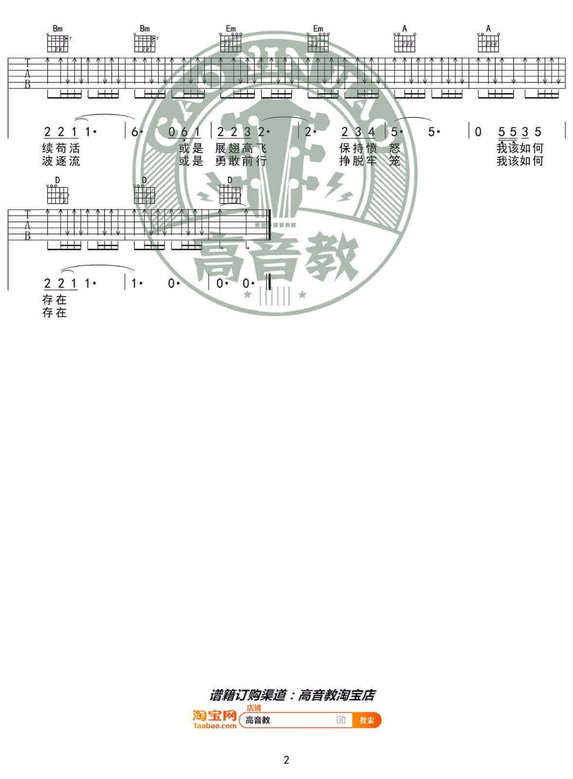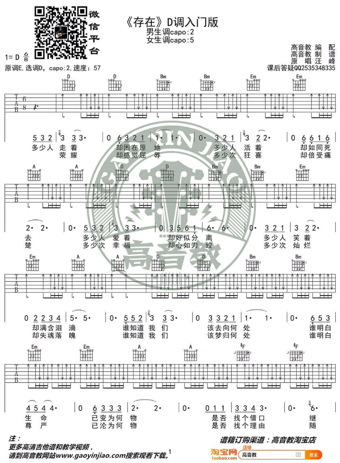 曲谱介绍: 此版本的曲谱来源于高音教,为了照顾新手,这里编配较为简单,省略前奏,采用D调指法编配,整首歌全扫弦的形式,节奏型也可以自行更换一下,这里是6/8拍的节奏,原调为D调,演唱时夹变调夹2品。 存在吉他谱_汪峰_《存在》D调简单版弹唱六线谱_高清图片谱1: