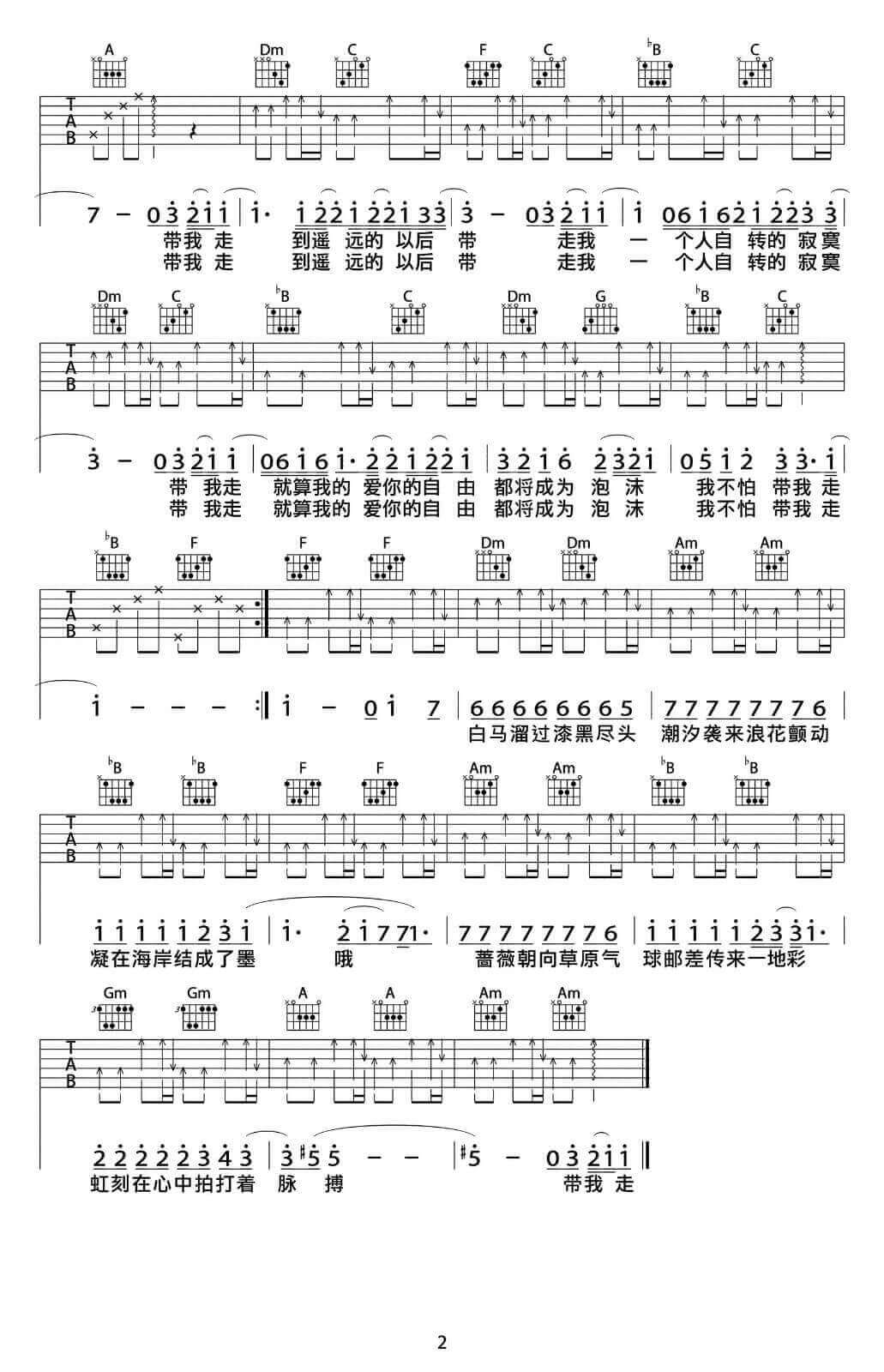 曲谱介绍: 杨丞琳/苏打绿《带我走》吉他弹唱谱,采用F调指法编配,共有2张高清图谱,免翻页排版设计。