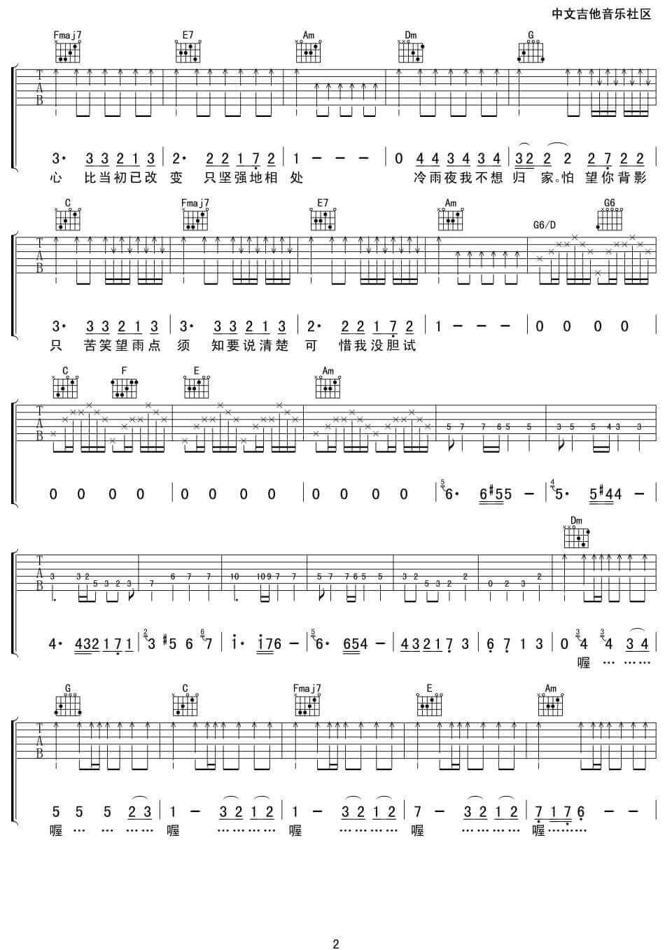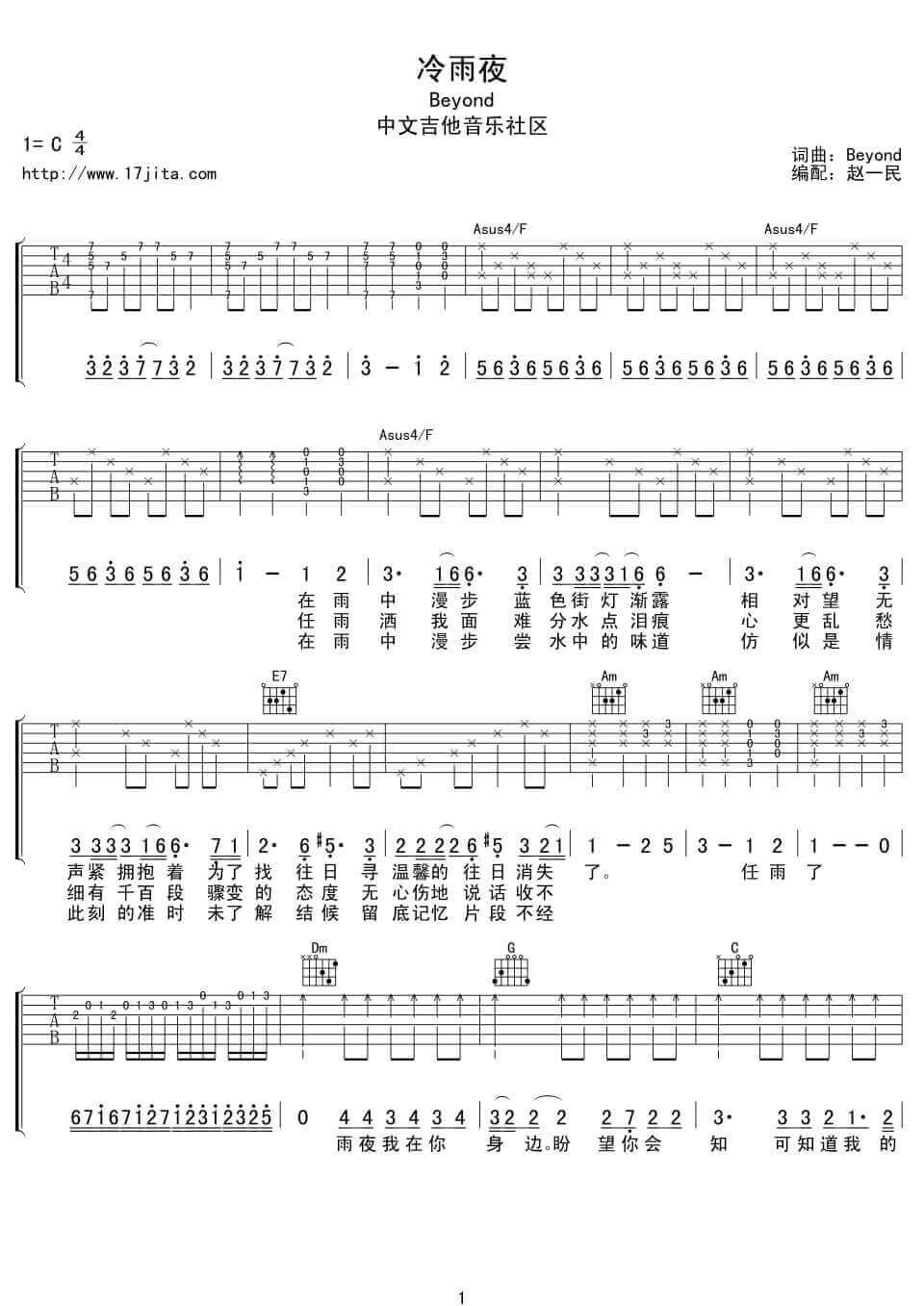 曲谱介绍: Beyond《冷雨夜》吉他弹唱谱,采用C调指法编配,17吉他编配出品,共有2张高清图谱,免翻页排版设计。