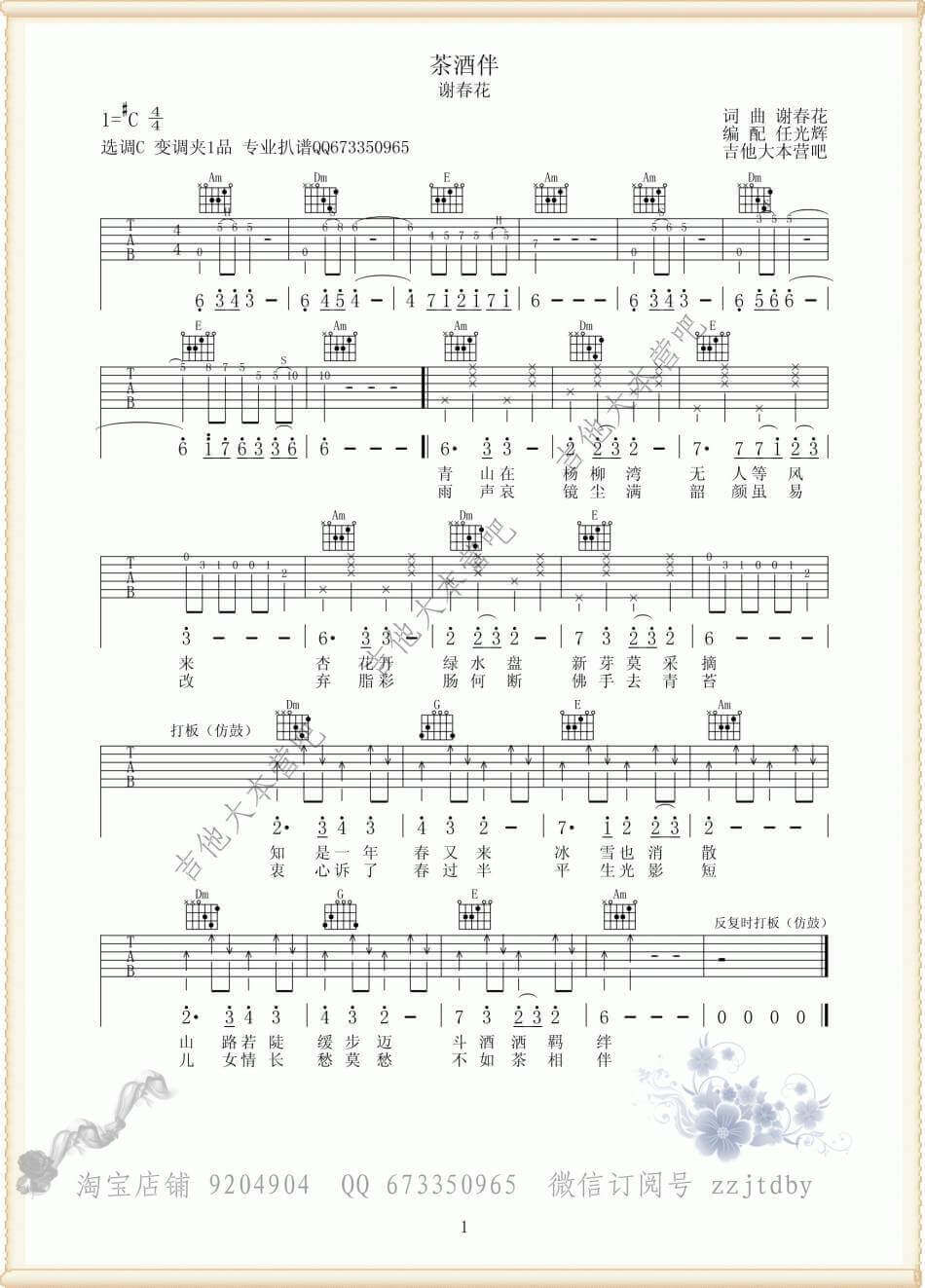 曲谱介绍: 谢春花《茶酒伴》吉他弹唱谱,采用C调指法编配,共有1张高清图谱,免翻页排版设计。