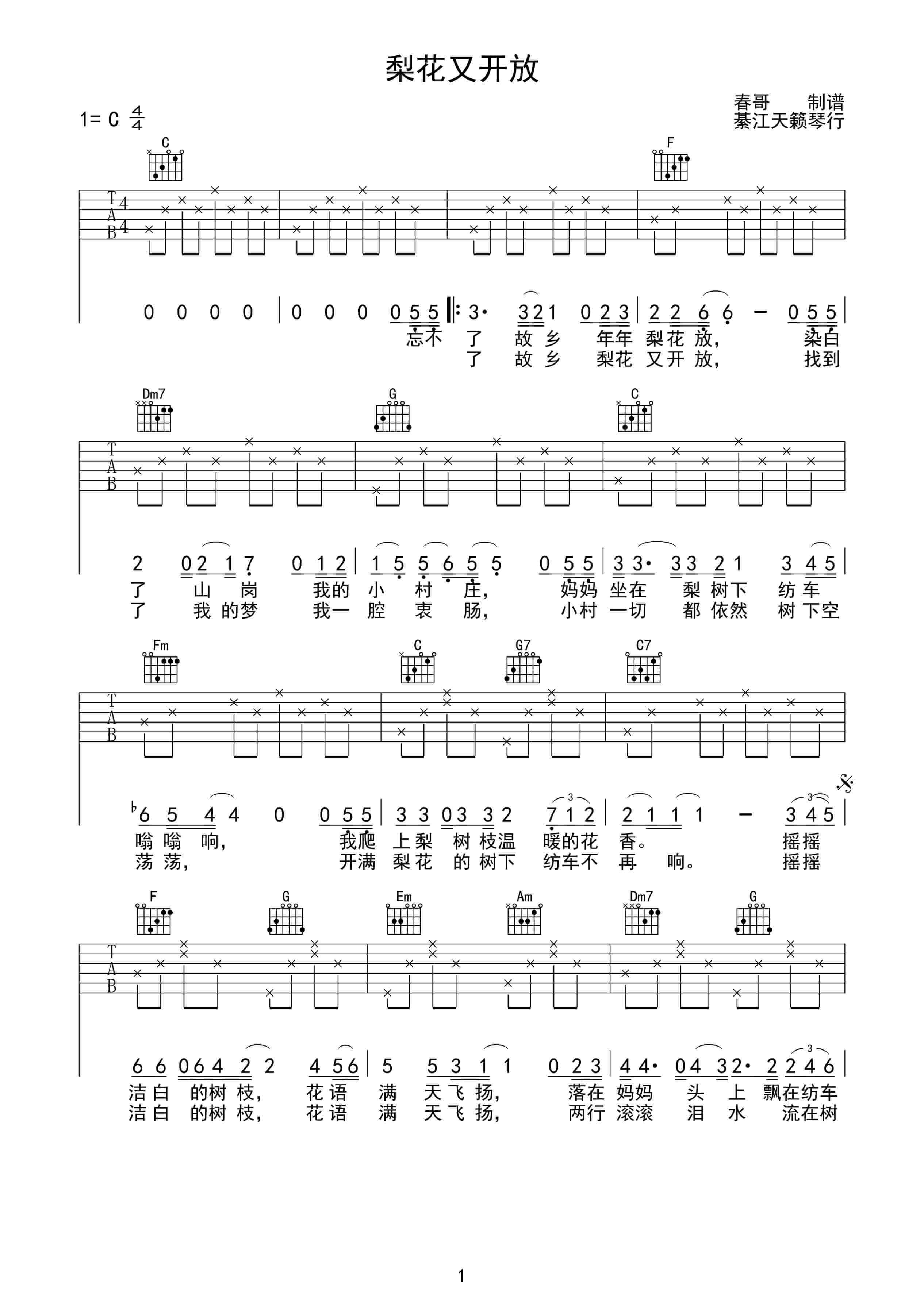 曲谱介绍: 周峰《梨花又开放》吉他弹唱谱,采用C调指法编配,天籁琴行编配出品,共有2张高清图谱,免翻页排版设计。