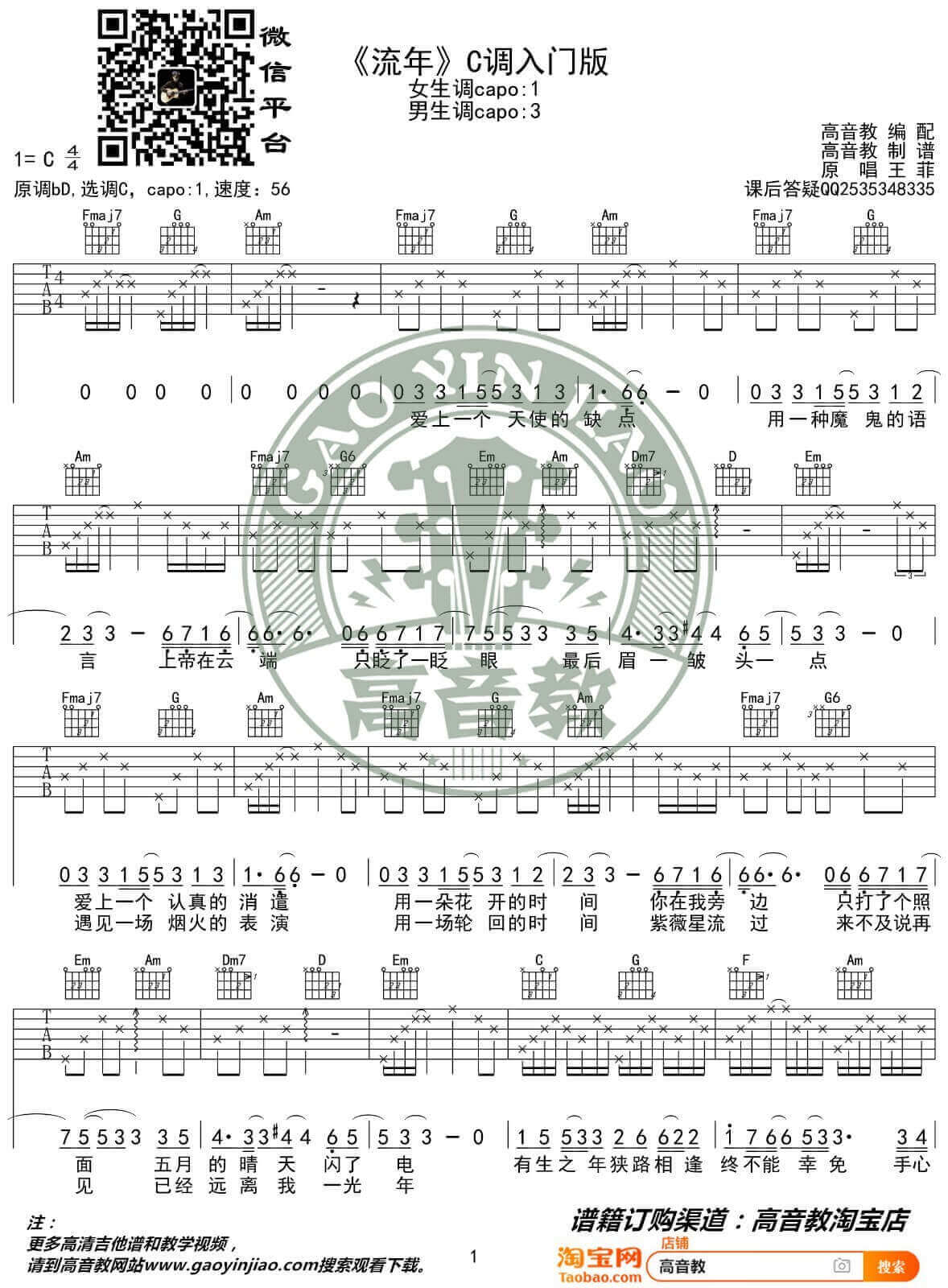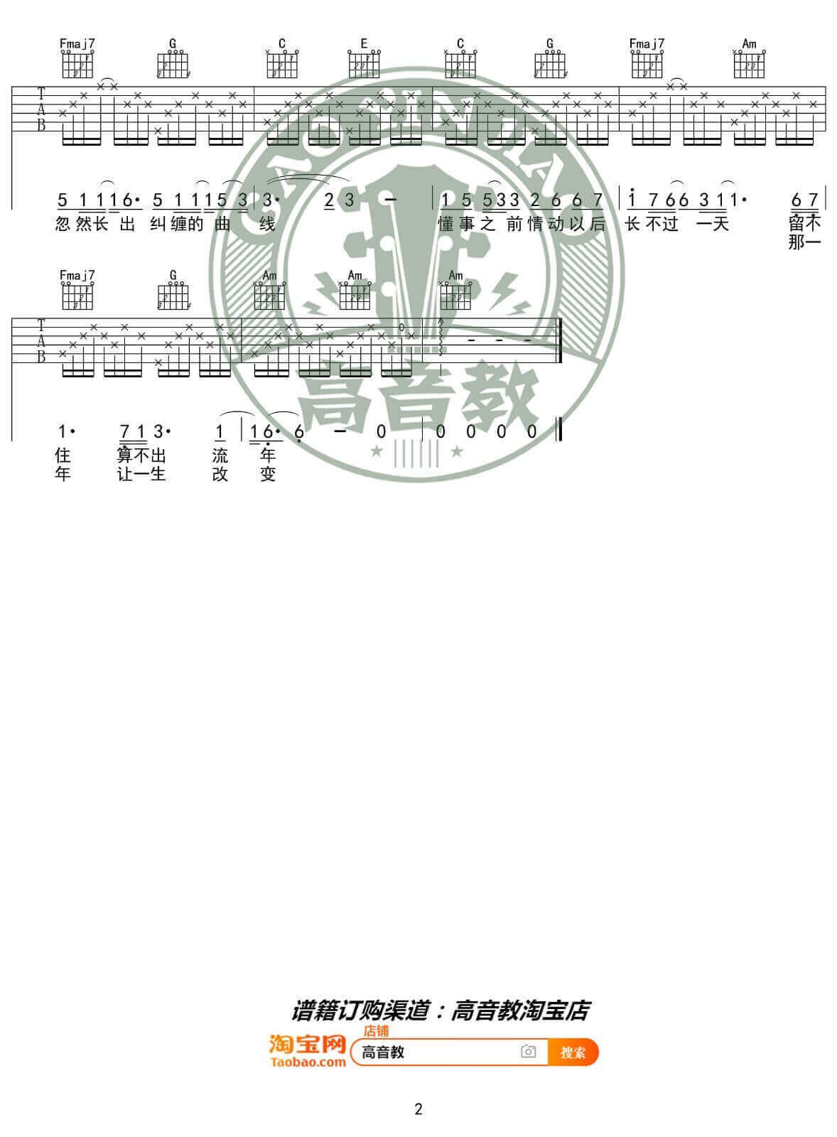 曲谱介绍: 王菲《流年》吉他弹唱谱,采用C调指法编配,高音教编配出品,共有2张高清图谱,免翻页排版设计。