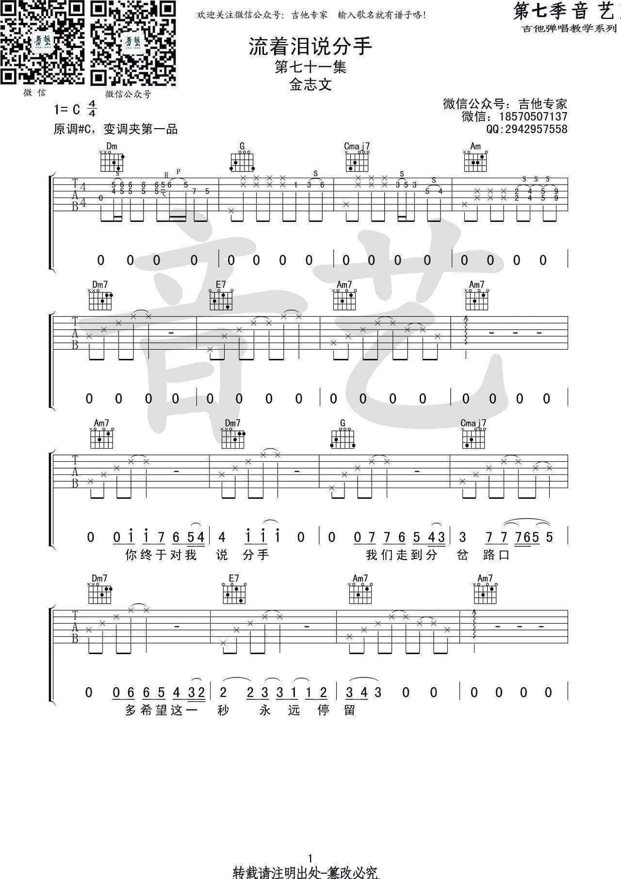 曲谱介绍: 金志文《流着泪说分手》吉他弹唱谱,采用C调指法编配,共有3张高清图谱。