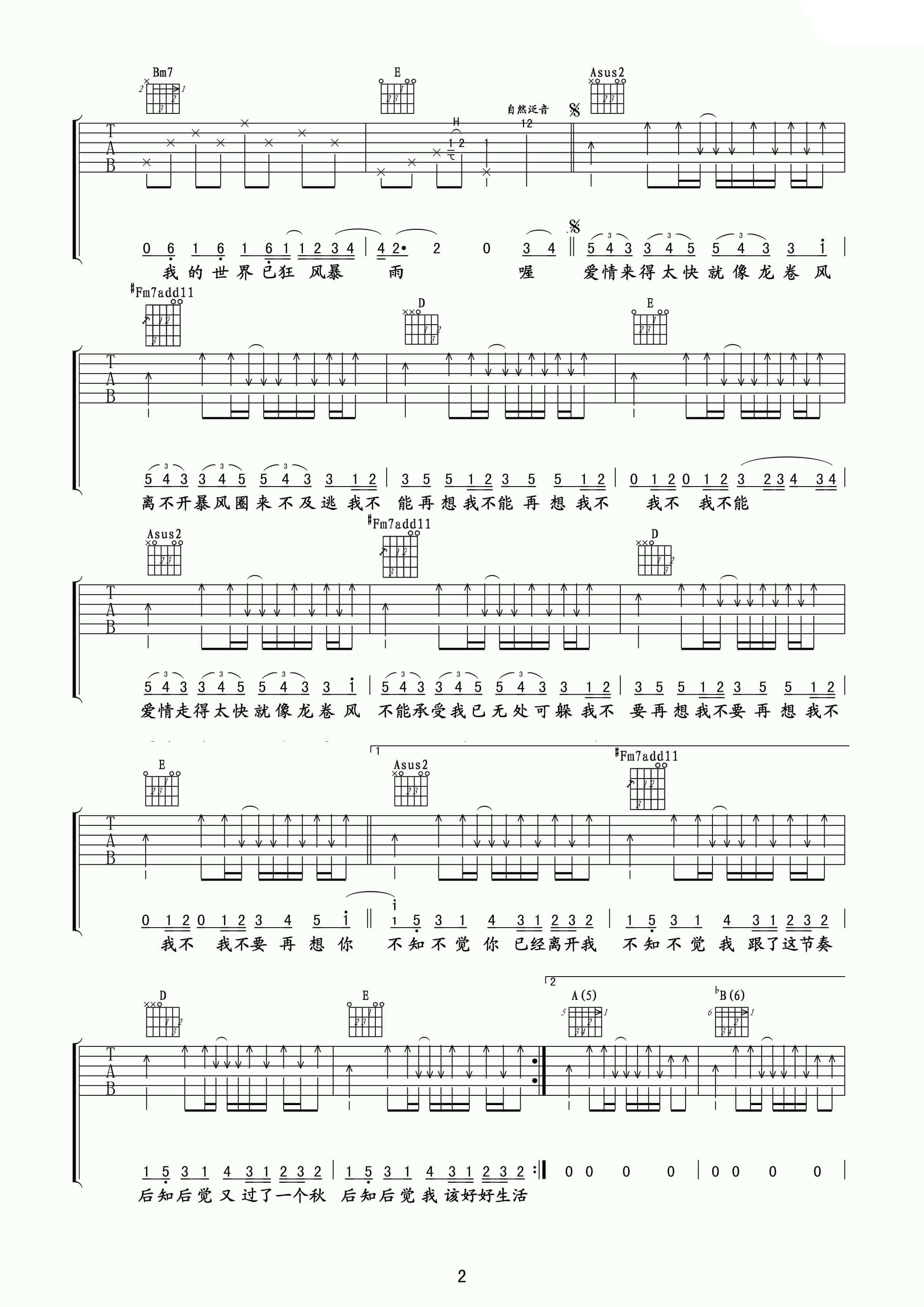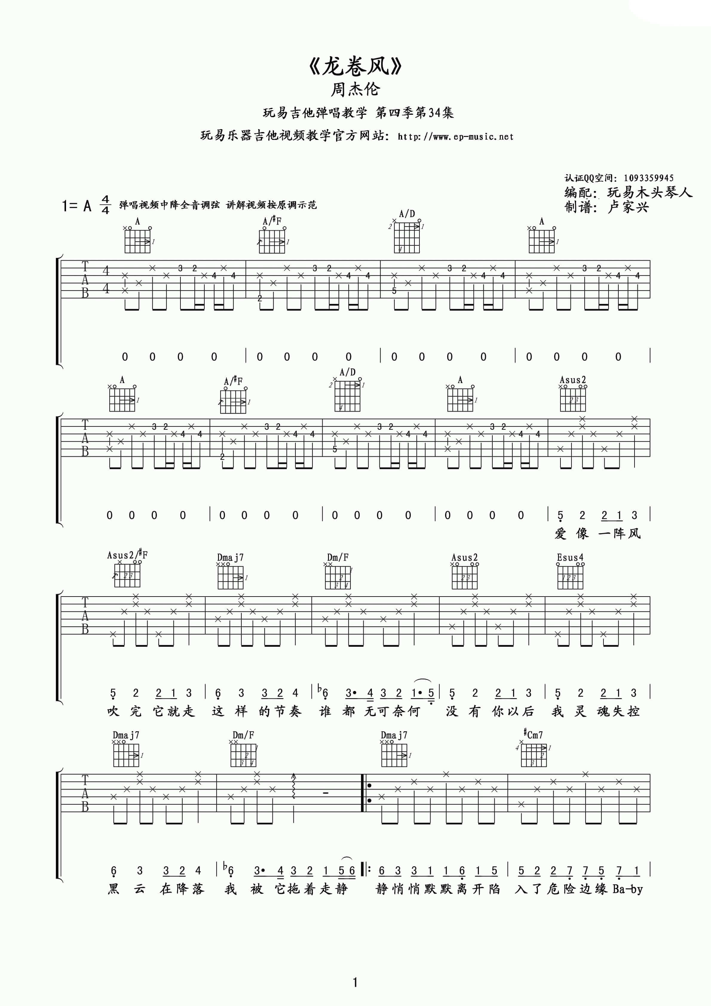 曲谱介绍: 周杰伦《龙卷风》吉他弹唱谱,采用A调指法编配,玩易乐器编配出品,共有3张高清图谱。
