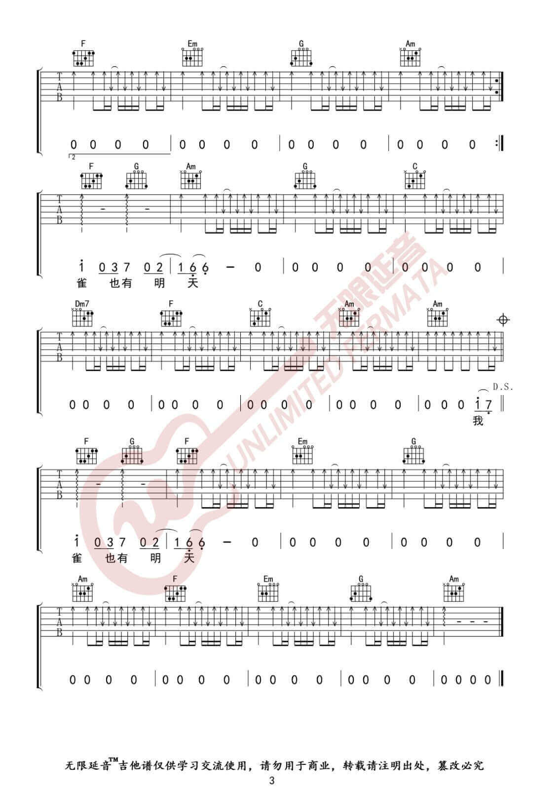 曲谱介绍: 李荣浩《麻雀》吉他弹唱谱,采用C调指法编配,无限延音编配出品,共有3张高清图谱。