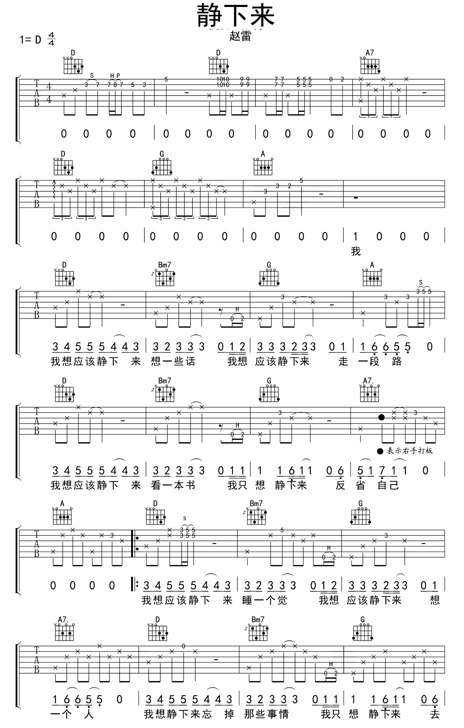曲谱介绍: 赵雷《静下来》吉他谱,D调指法。赵雷几年前的词曲创作民谣歌曲,大乔小乔原唱收录于专辑《渔樵问答》,老歌新编。这首歌就如歌名一样,旋律温婉动听,温柔中透出力量,叩问着自己的心灵,将希望与力量带给每一个需要温暖的人。​