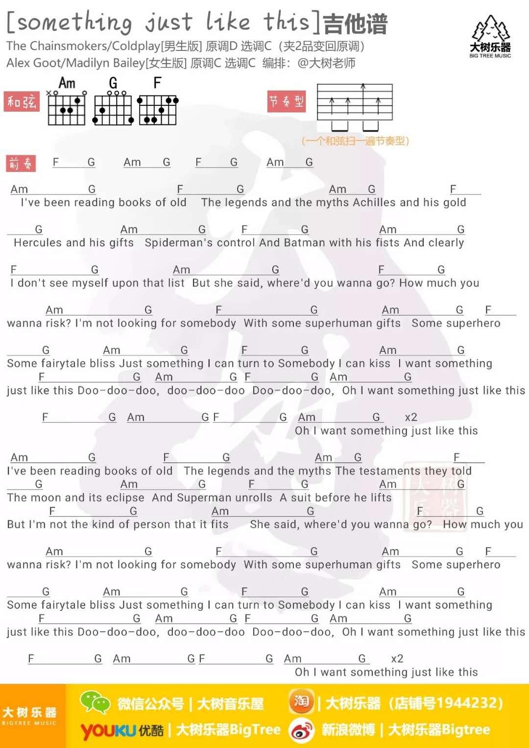 曲谱介绍: Something《SomethingJustLikeThis_C调》吉他弹唱谱,采用C调指法编配,共有1张高清图谱,免翻页排版设计。