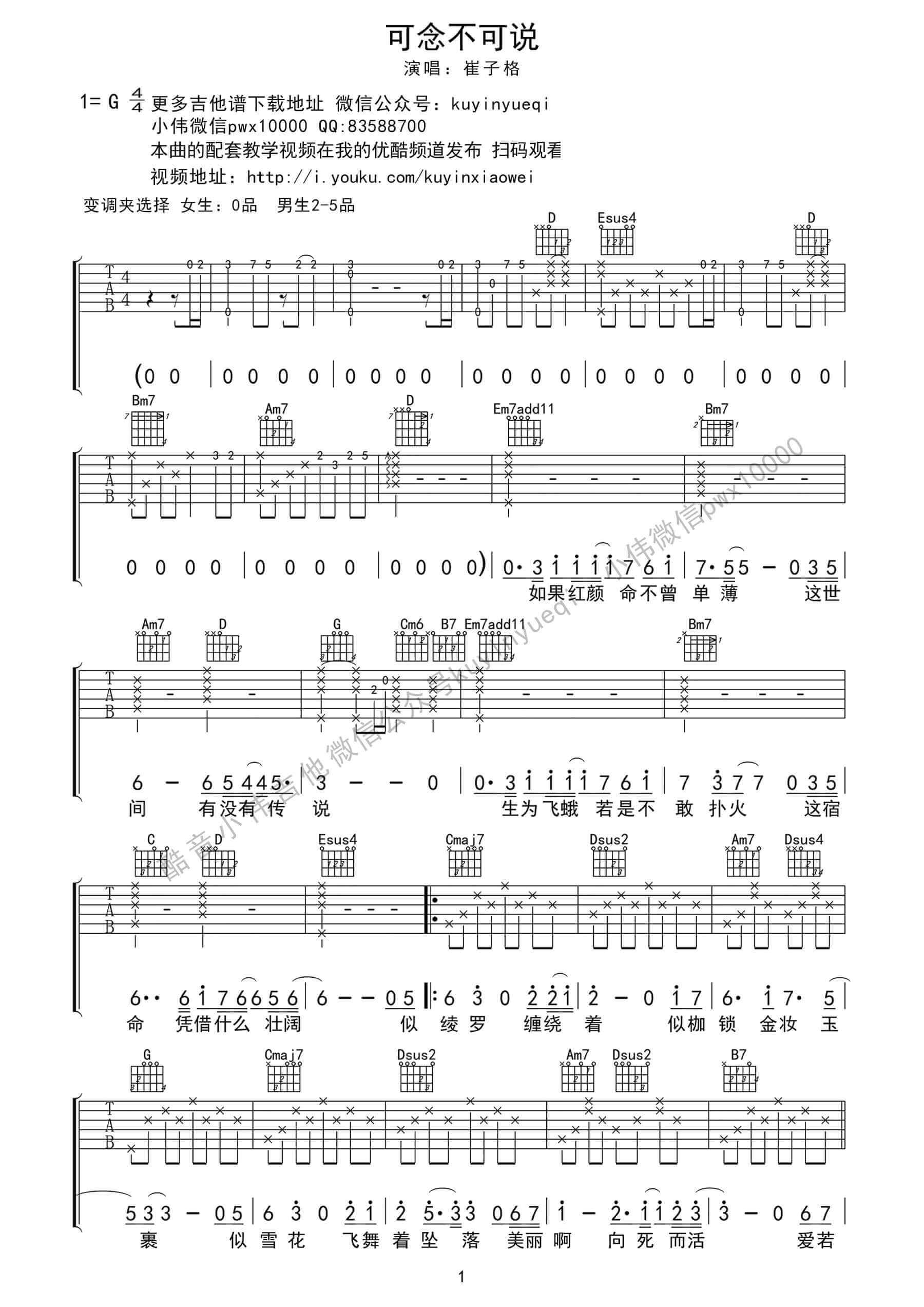 曲谱介绍: 崔子格《可念不可说》吉他弹唱谱,采用G调指法编配,共有2张高清图谱,免翻页排版设计。