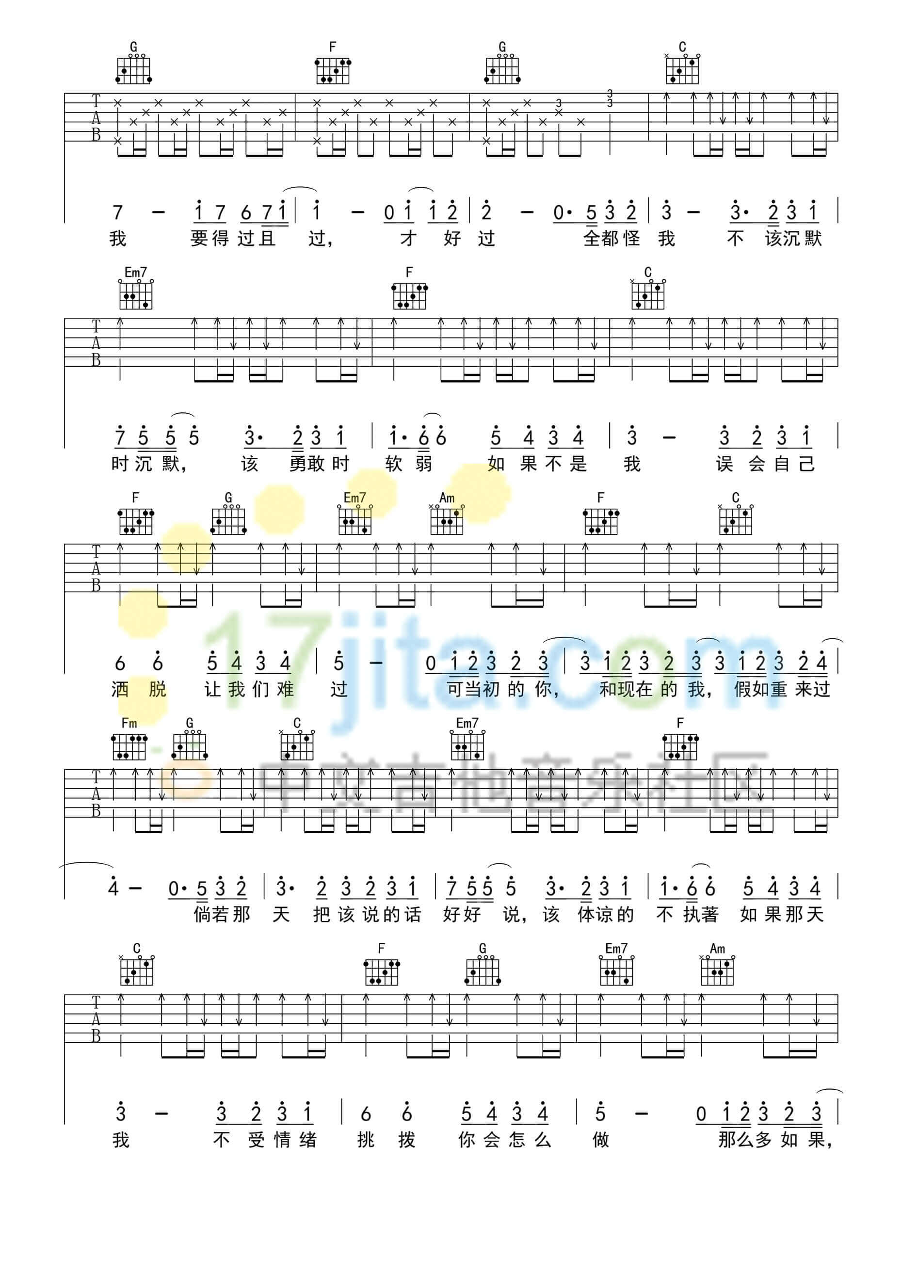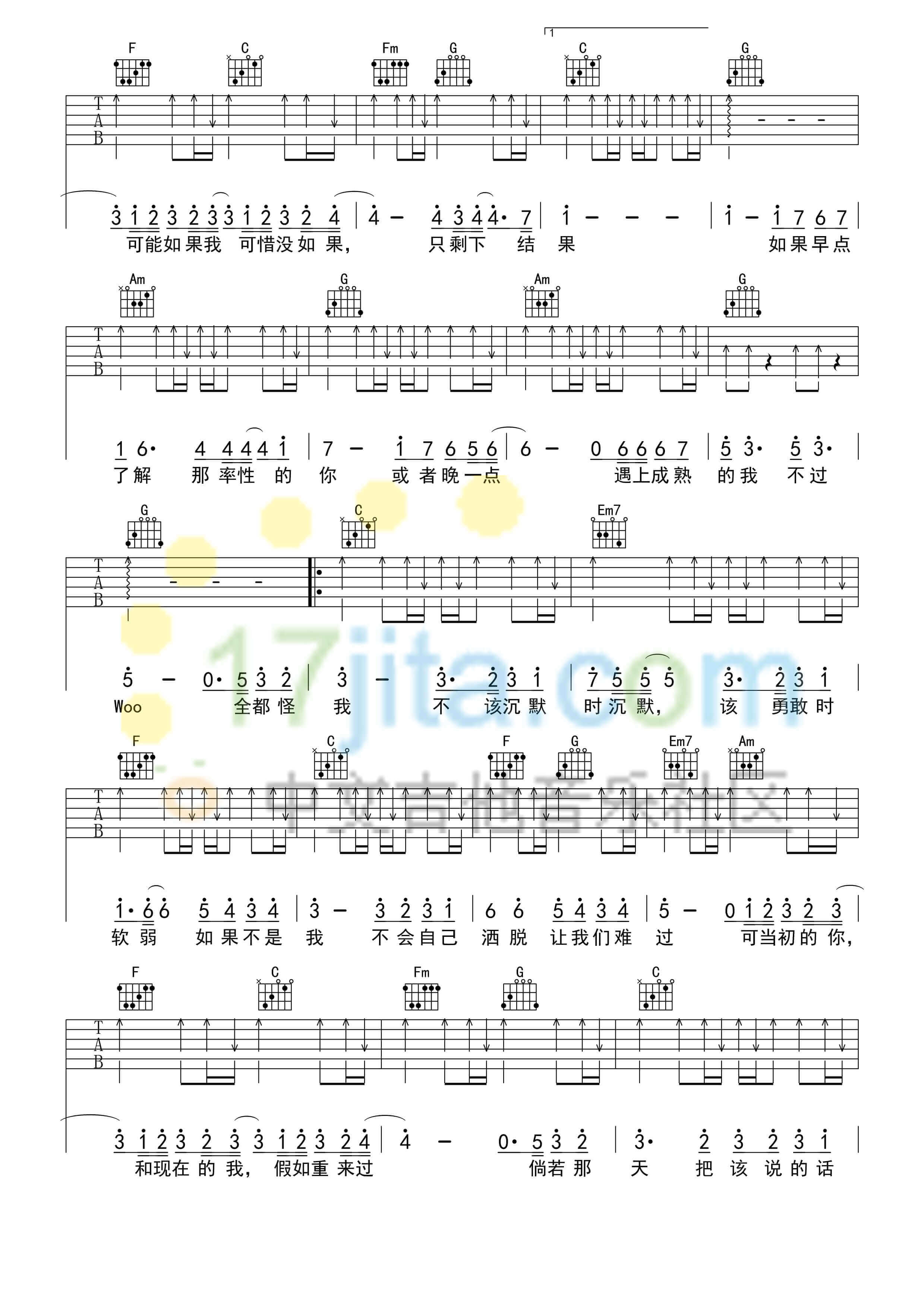 曲谱介绍: 林俊杰《可惜没如果》吉他弹唱谱,采用C调指法编配,17吉他编配出品,共有4张高清图谱。