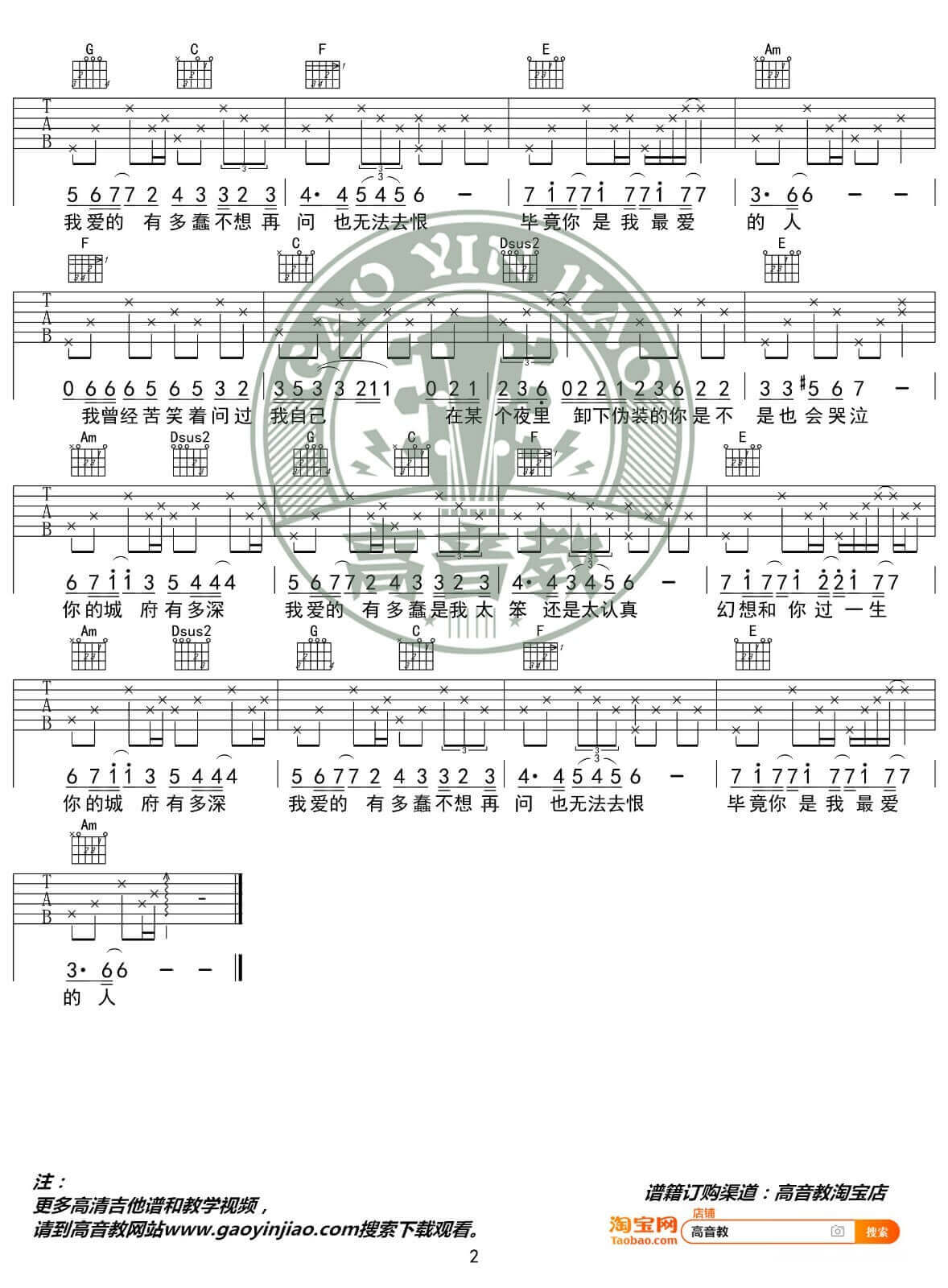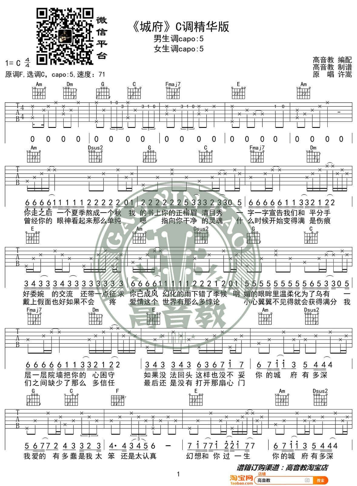 曲谱介绍: 许嵩《城府》吉他弹唱谱,采用C调指法编配,高音教编配出品,共有2张高清图谱,免翻页排版设计。