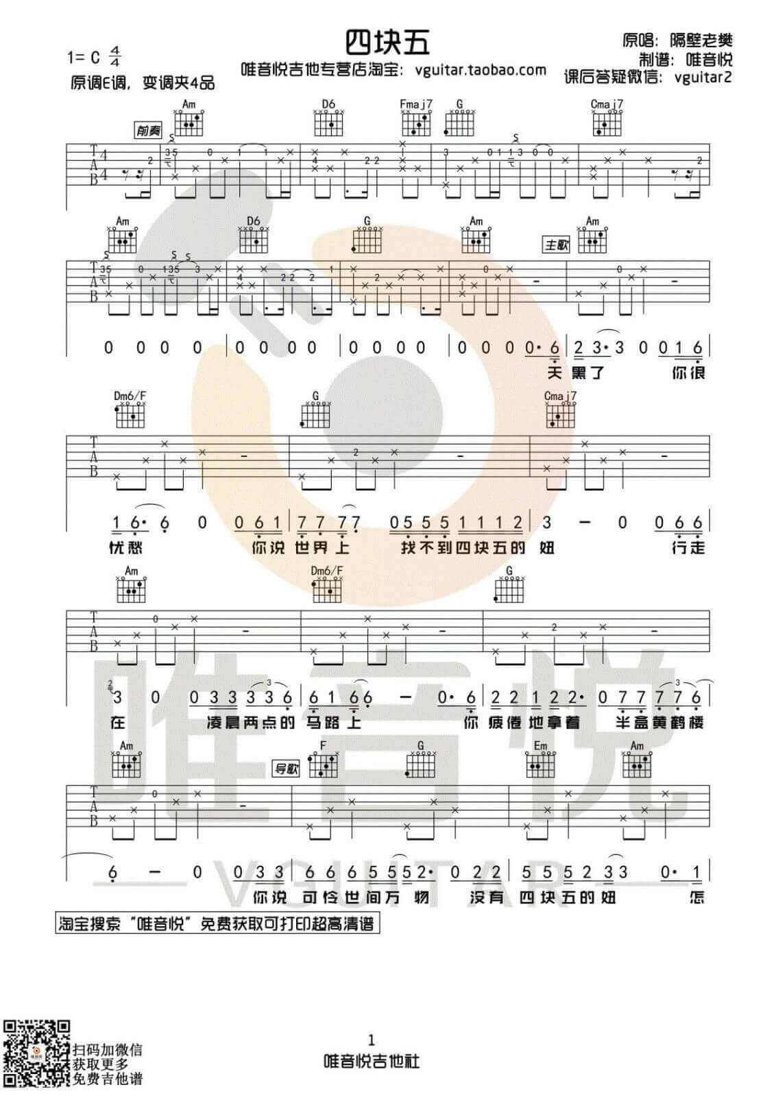 四块五吉他谱 - 隔壁老樊 - C调吉他弹唱谱