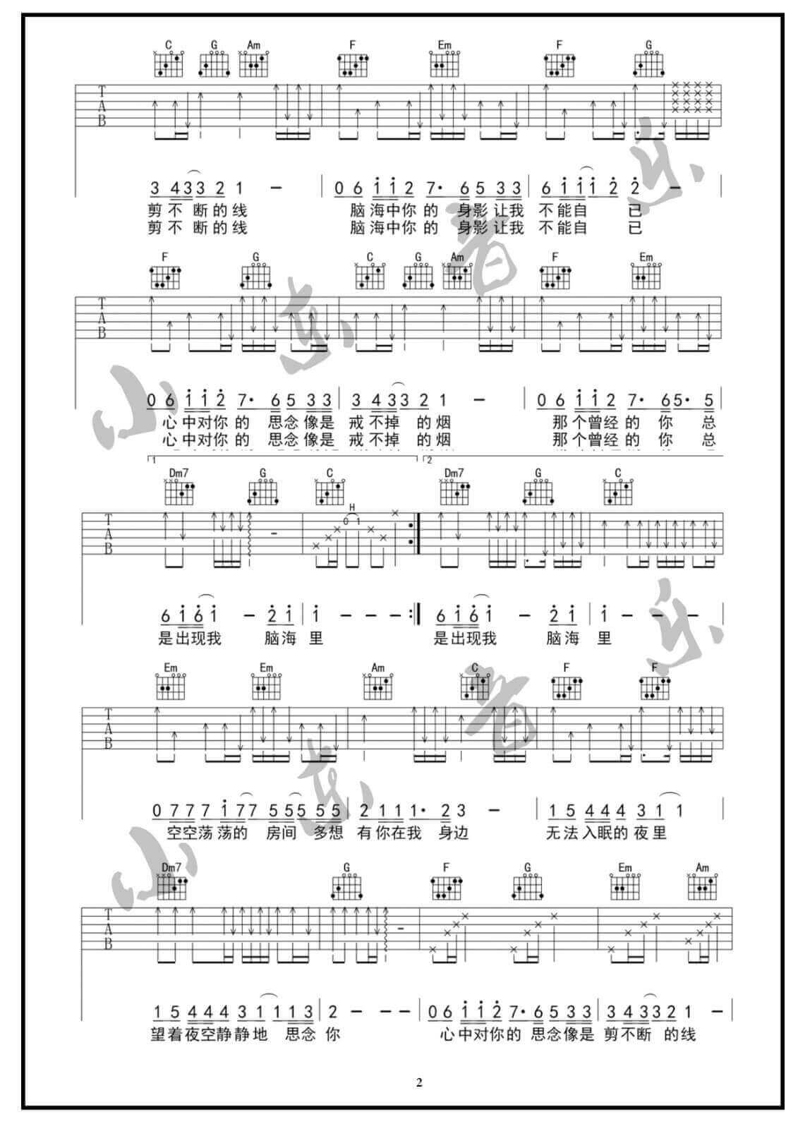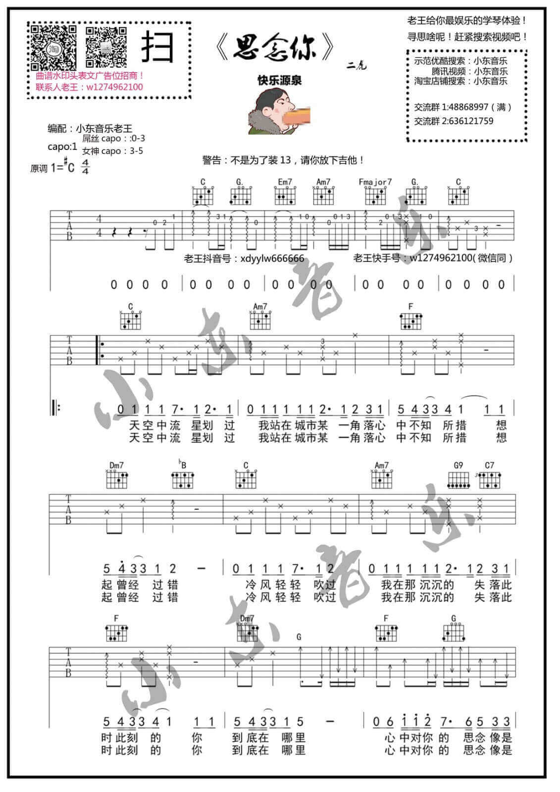 曲谱介绍: 虎二《思念你》吉他弹唱谱,采用C调指法编配,小东音乐编配出品,共有3张高清图谱。