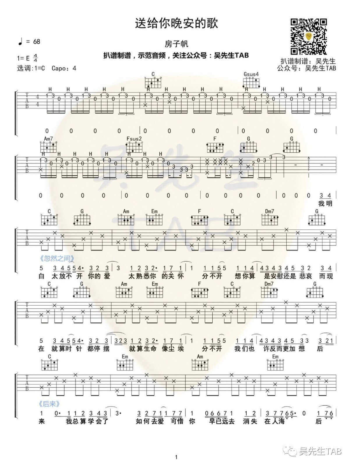 曲谱介绍: 房子帆《送给你晚安的歌》吉他弹唱谱,采用C调指法编配,共有2张高清图谱,免翻页排版设计。