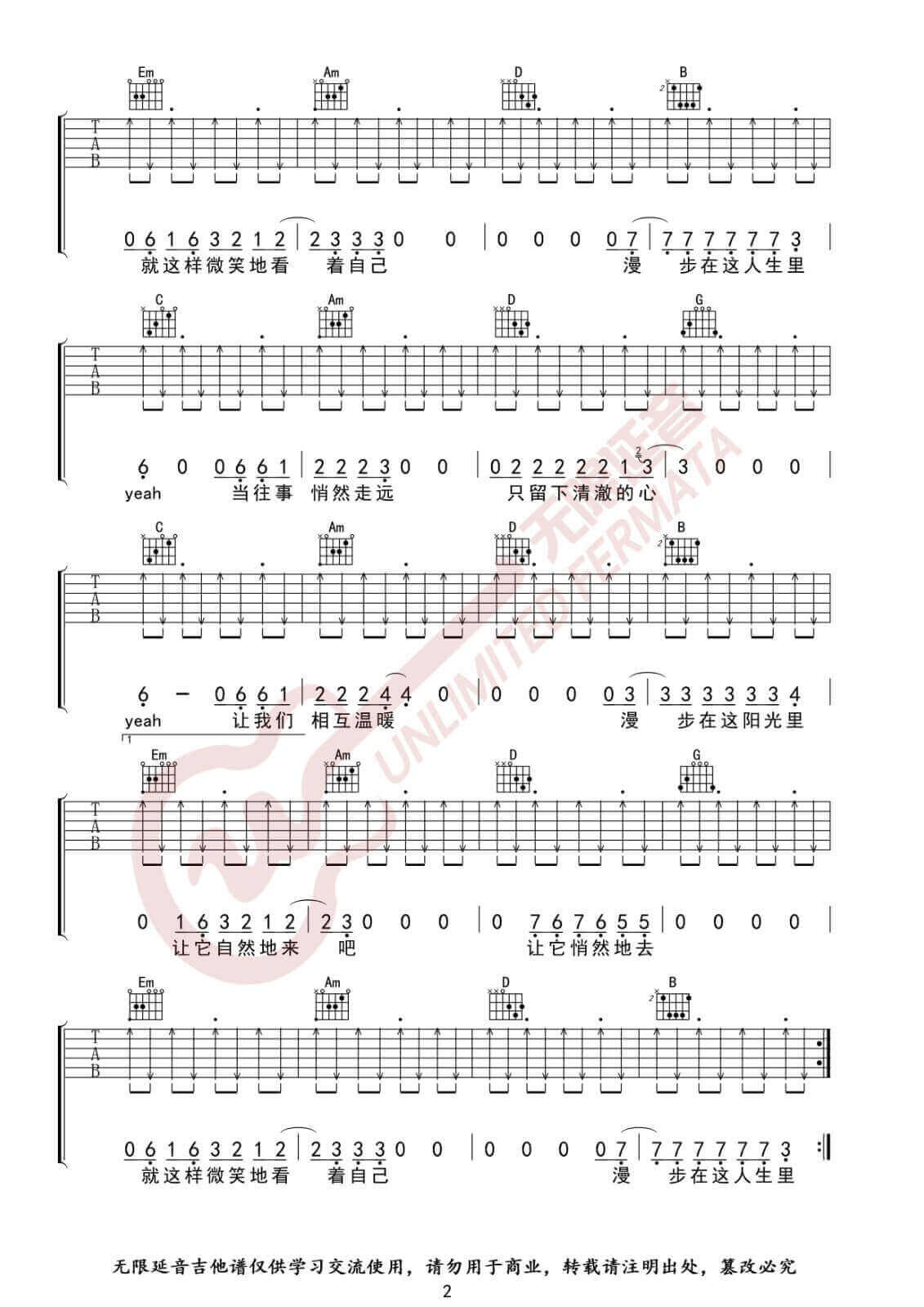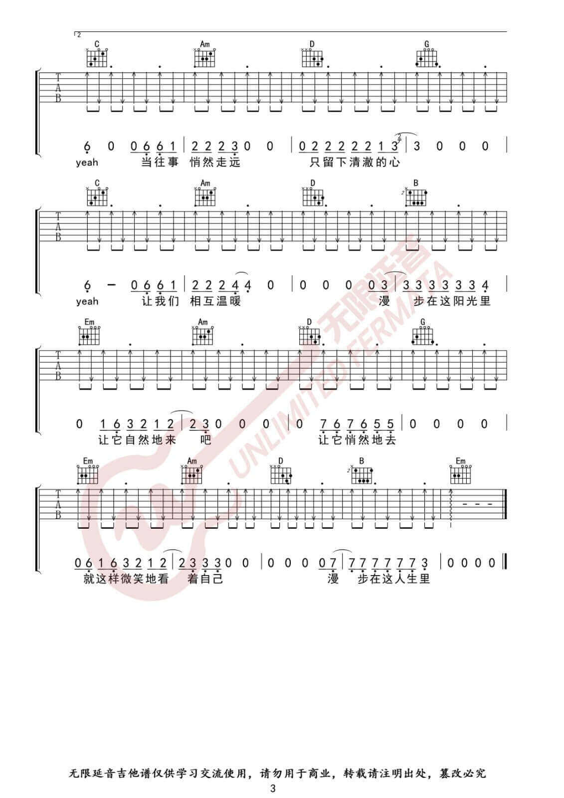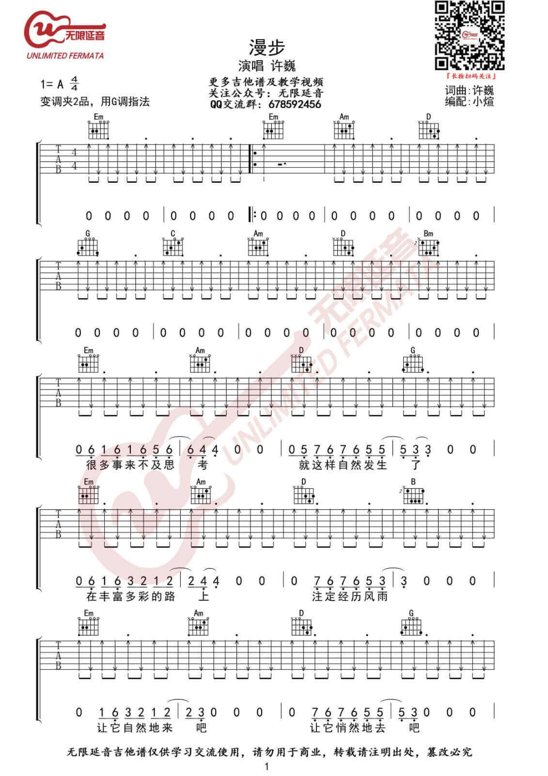 曲谱介绍: 许巍《漫步》吉他弹唱谱,采用G调指法编配,无限延音编配出品,共有3张高清图谱。