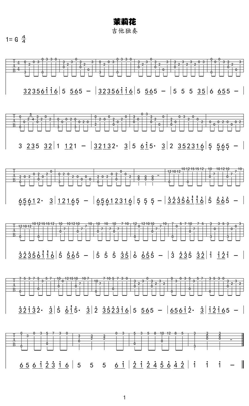 曲谱介绍: 《茉莉花》吉他独奏谱,共有1张高清图谱,免翻页排版设计。