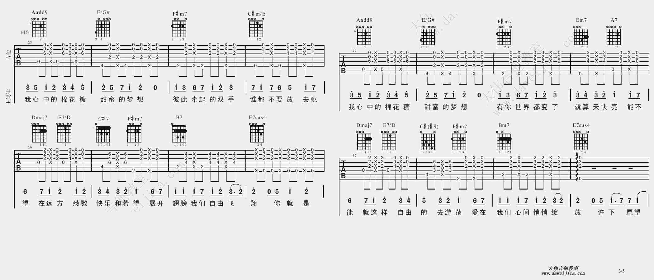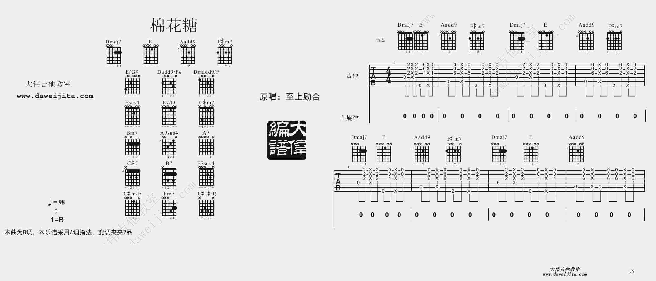 曲谱介绍: 至上励合《棉花糖》吉他弹唱谱,采用A调指法编配,共有5张高清图谱。