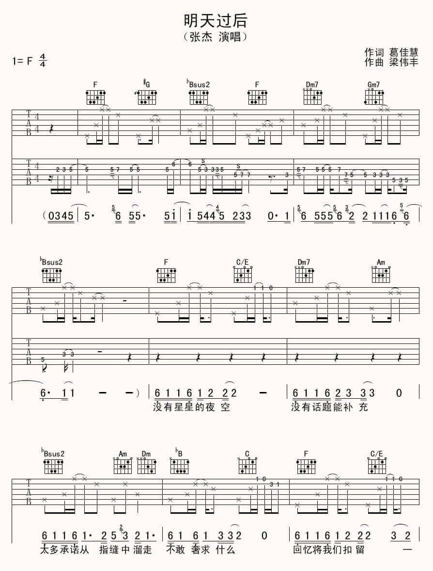 明天过后吉他谱 - 张杰 - F调吉他弹唱谱