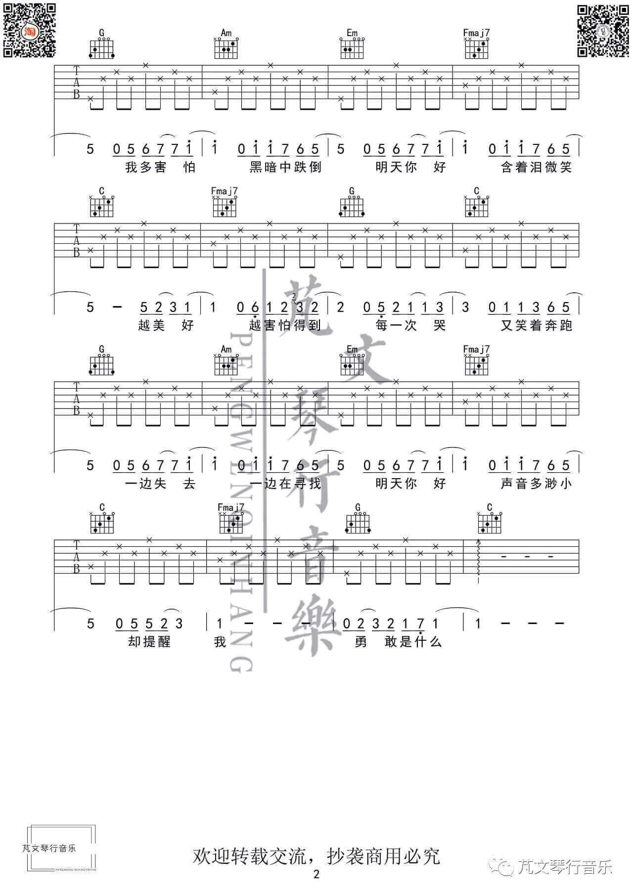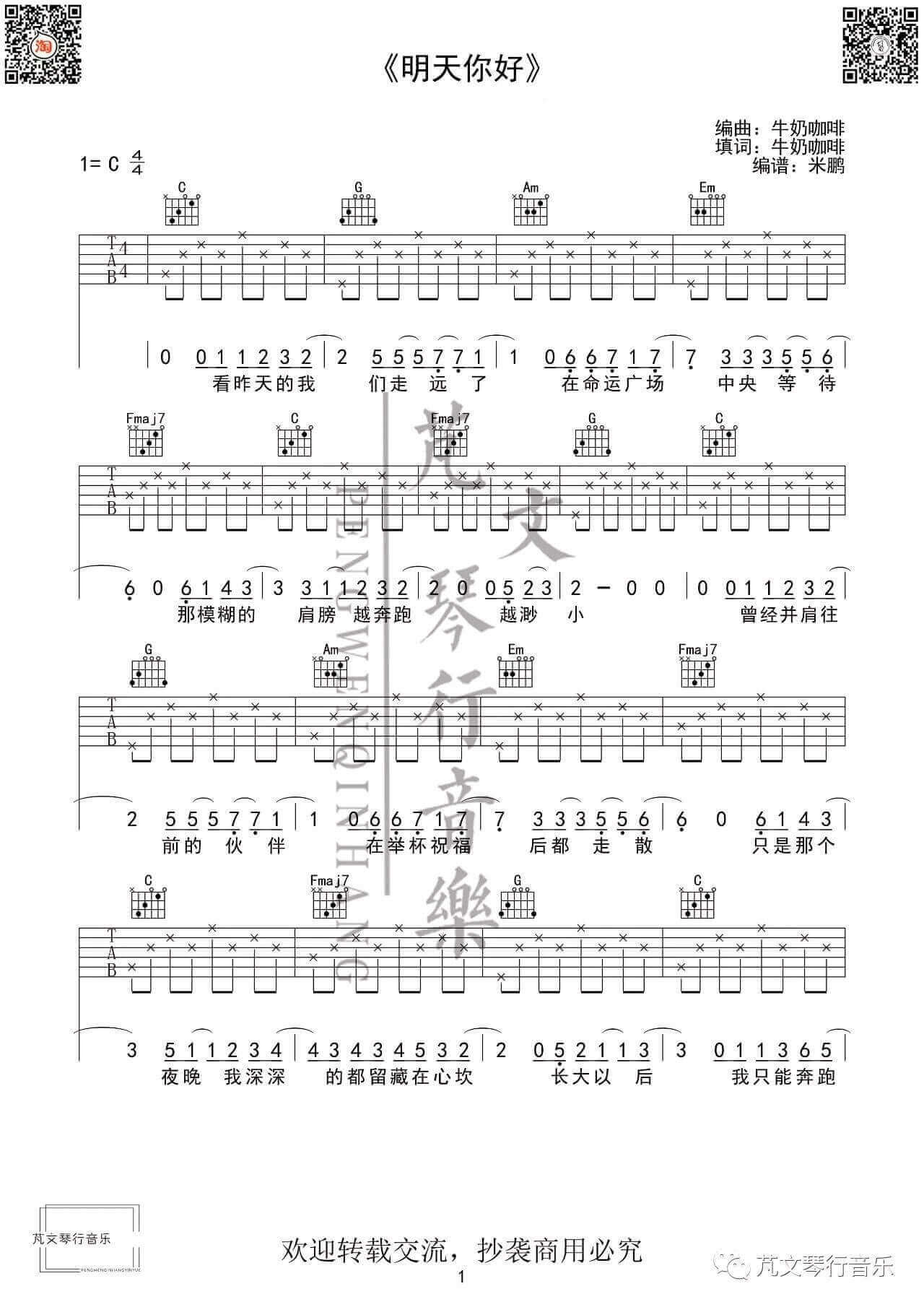 曲谱介绍: 牛奶咖啡《明天你好》吉他弹唱谱,采用C调指法编配,芃文音乐编配出品,共有2张高清图谱,免翻页排版设计。