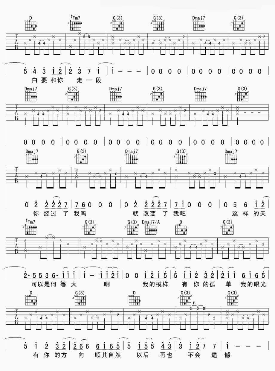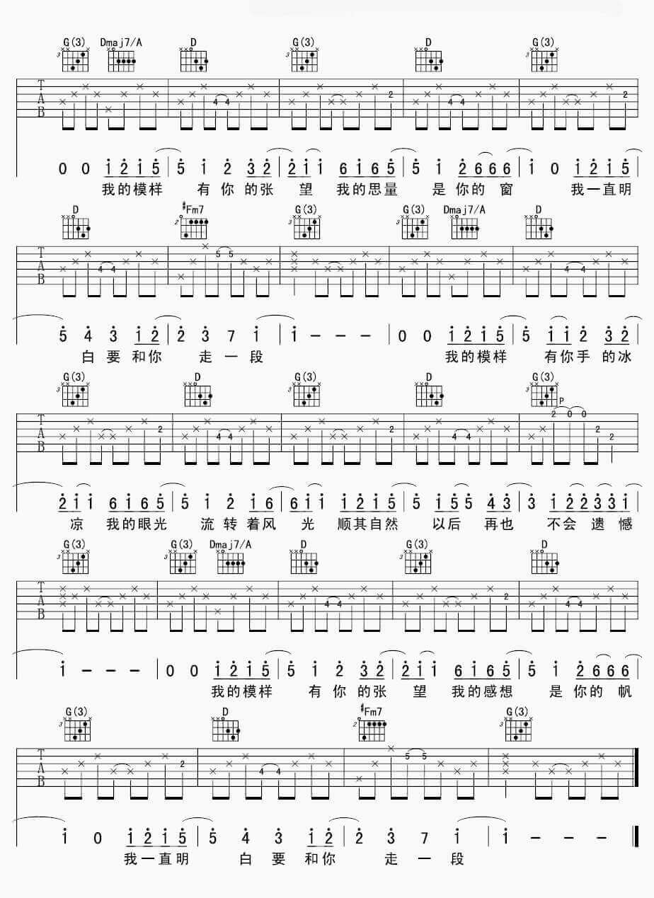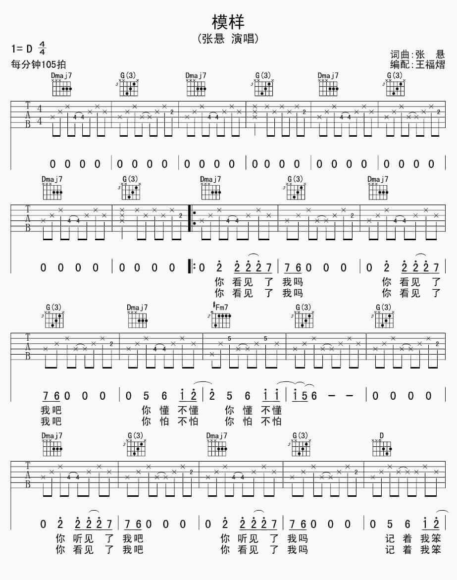 曲谱介绍: 张悬《模样》吉他弹唱谱,采用D调指法编配,共有4张高清图谱。