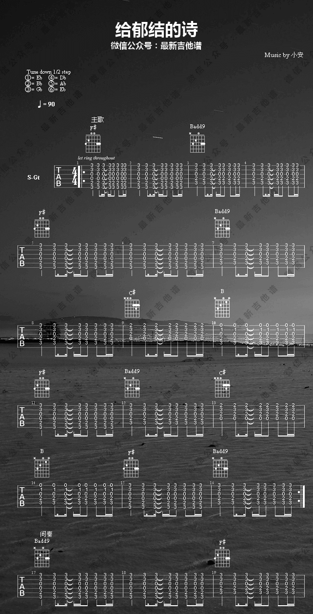 曲谱介绍: 小安《给郁结的诗》吉他弹唱谱,采用F调指法编配,共有1张高清图谱,免翻页排版设计。