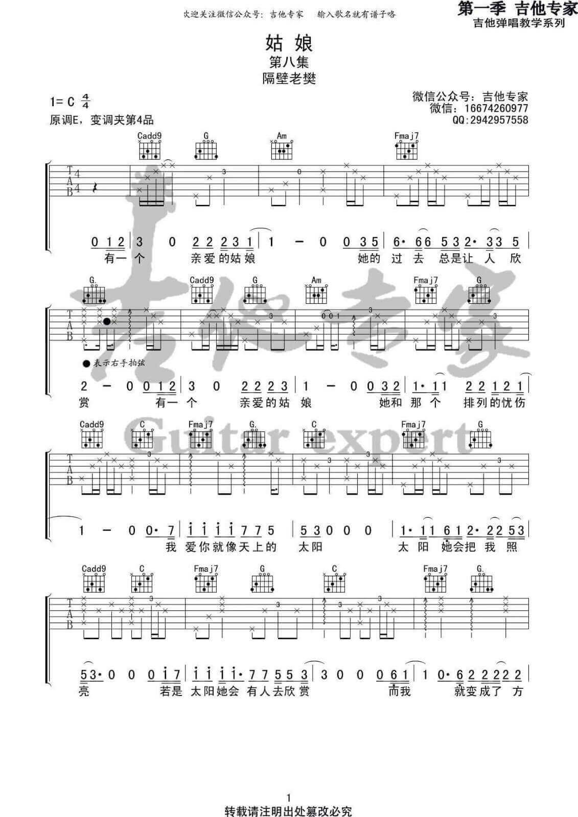 曲谱介绍: 隔壁老樊《姑娘》吉他弹唱谱,采用C调指法编配,共有3张高清图谱。