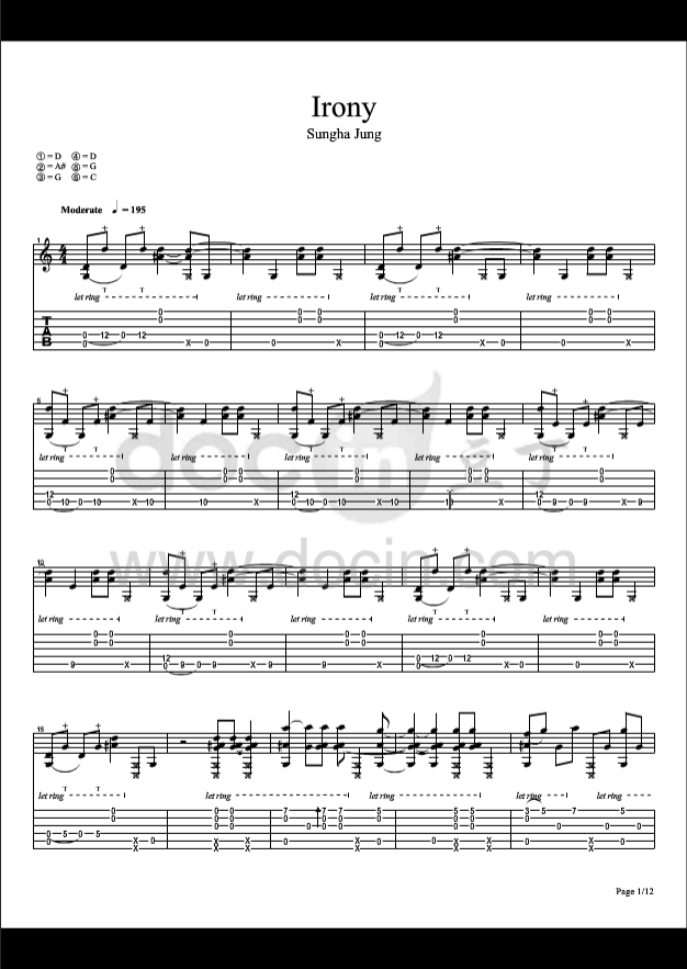 曲谱介绍: 郑成河《irony》吉他独奏谱,采用D调指法编配,豆丁网编配出品,共有12张高清图谱。