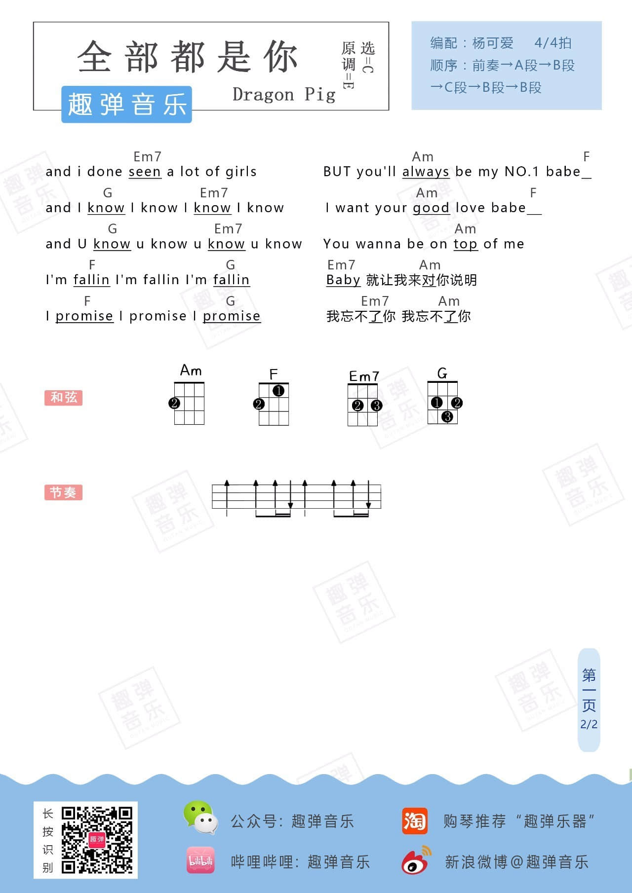 曲谱介绍: Dragon《全部都是你》吉他弹唱谱,采用C调指法编配,趣弹音乐编配出品,共有2张高清图谱,免翻页排版设计。