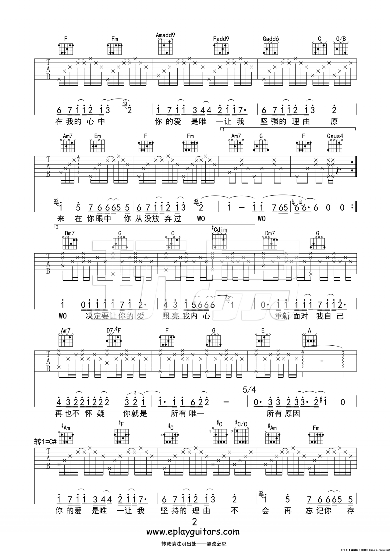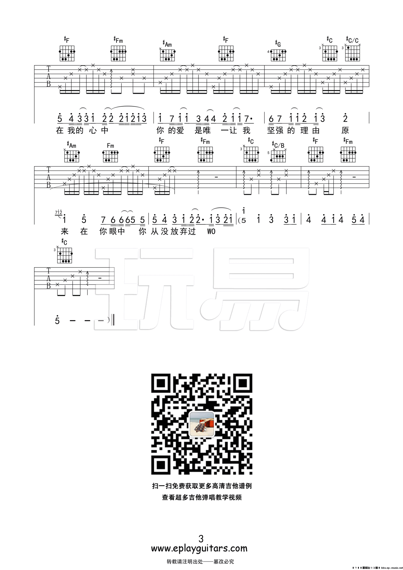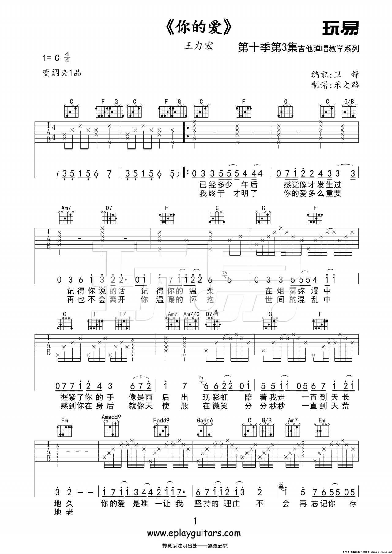 曲谱介绍: 王力宏《你的爱》吉他弹唱谱,采用C调指法编配,玩易吉他编配出品,共有3张高清图谱。