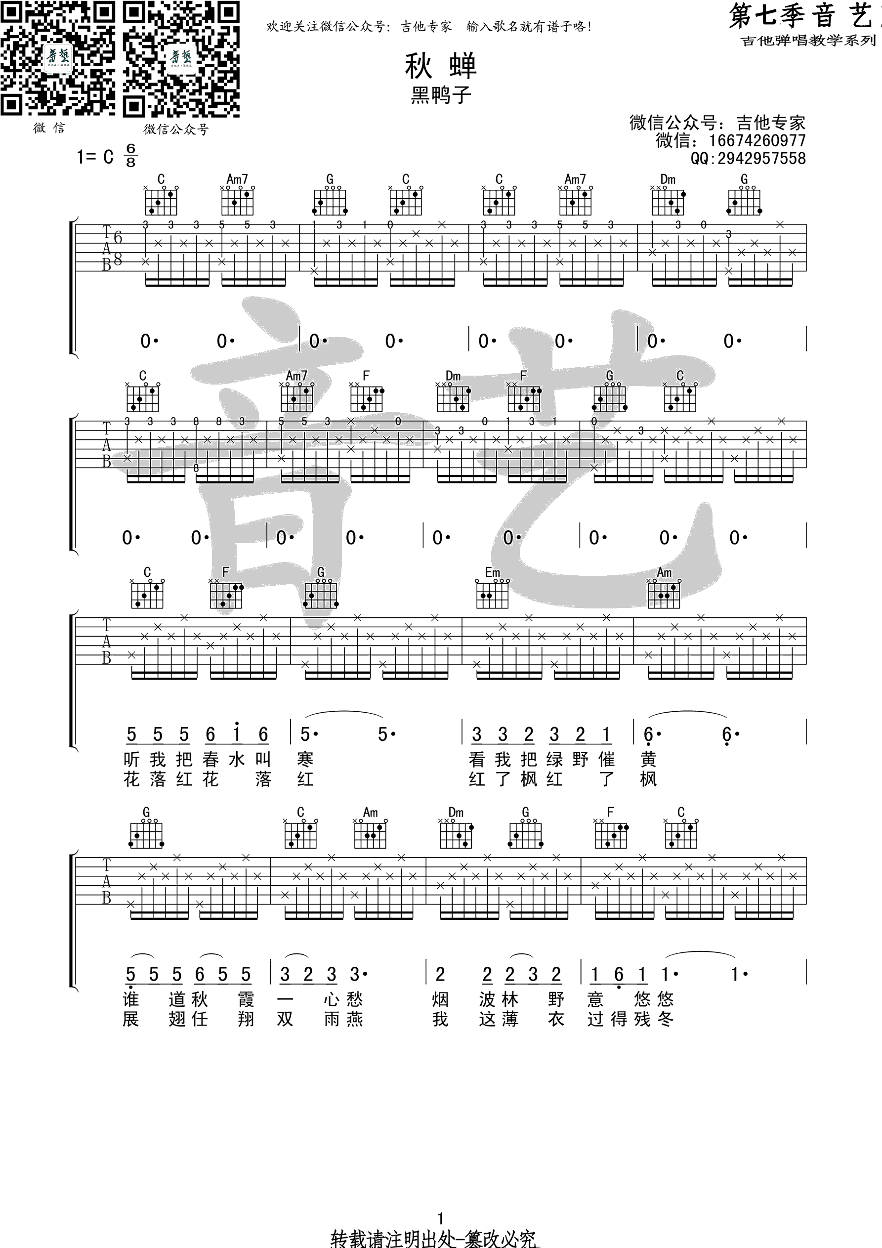 秋蝉吉他谱 - 黑鸭子 - C调吉他弹唱谱