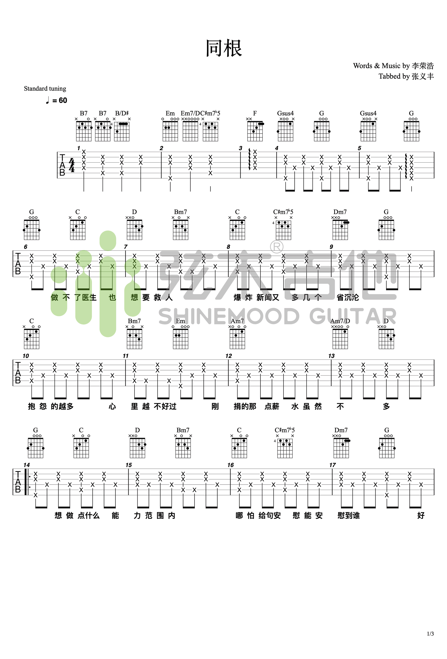 曲谱介绍: 李荣浩《同根》吉他弹唱谱,采用C调指法编配,弦木吉他编配出品,共有3张高清图谱。