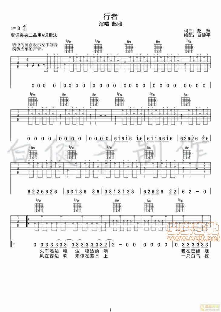 曲谱介绍: 赵照《行者》吉他弹唱谱,采用B调指法编配,虫虫吉他编配出品,共有5张高清图谱。
