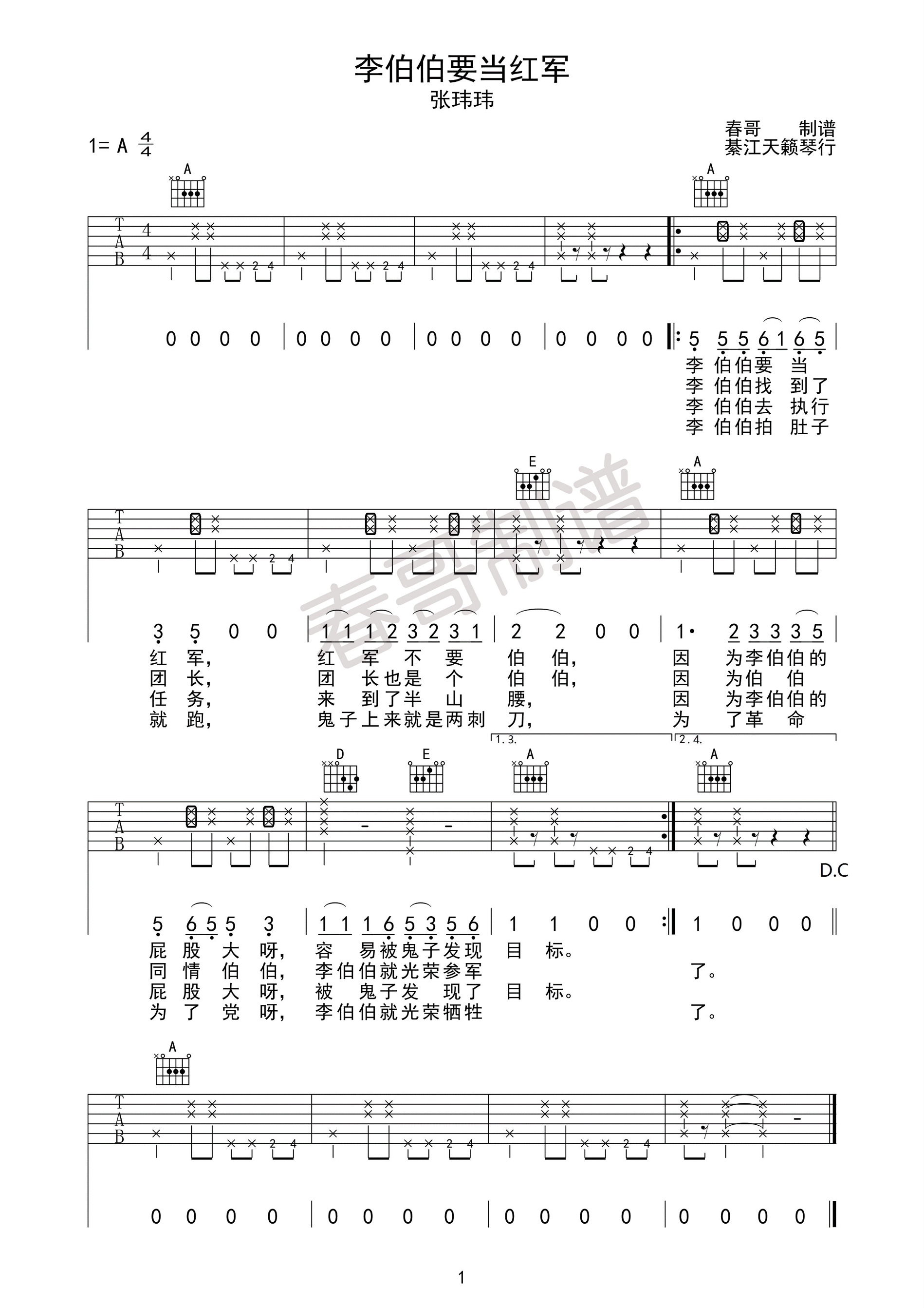 曲谱介绍: 张玮玮《李伯伯要当红军》吉他弹唱谱,采用A调指法编配,天籁琴行编配出品,共有1张高清图谱,免翻页排版设计。