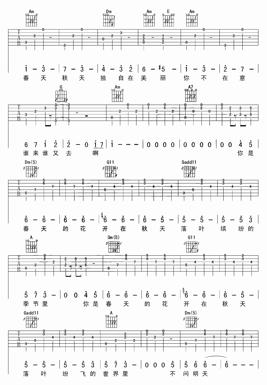 曲谱介绍: 附前奏《春花秋开》吉他弹唱谱,采用C调指法编配,共有4张高清图谱。