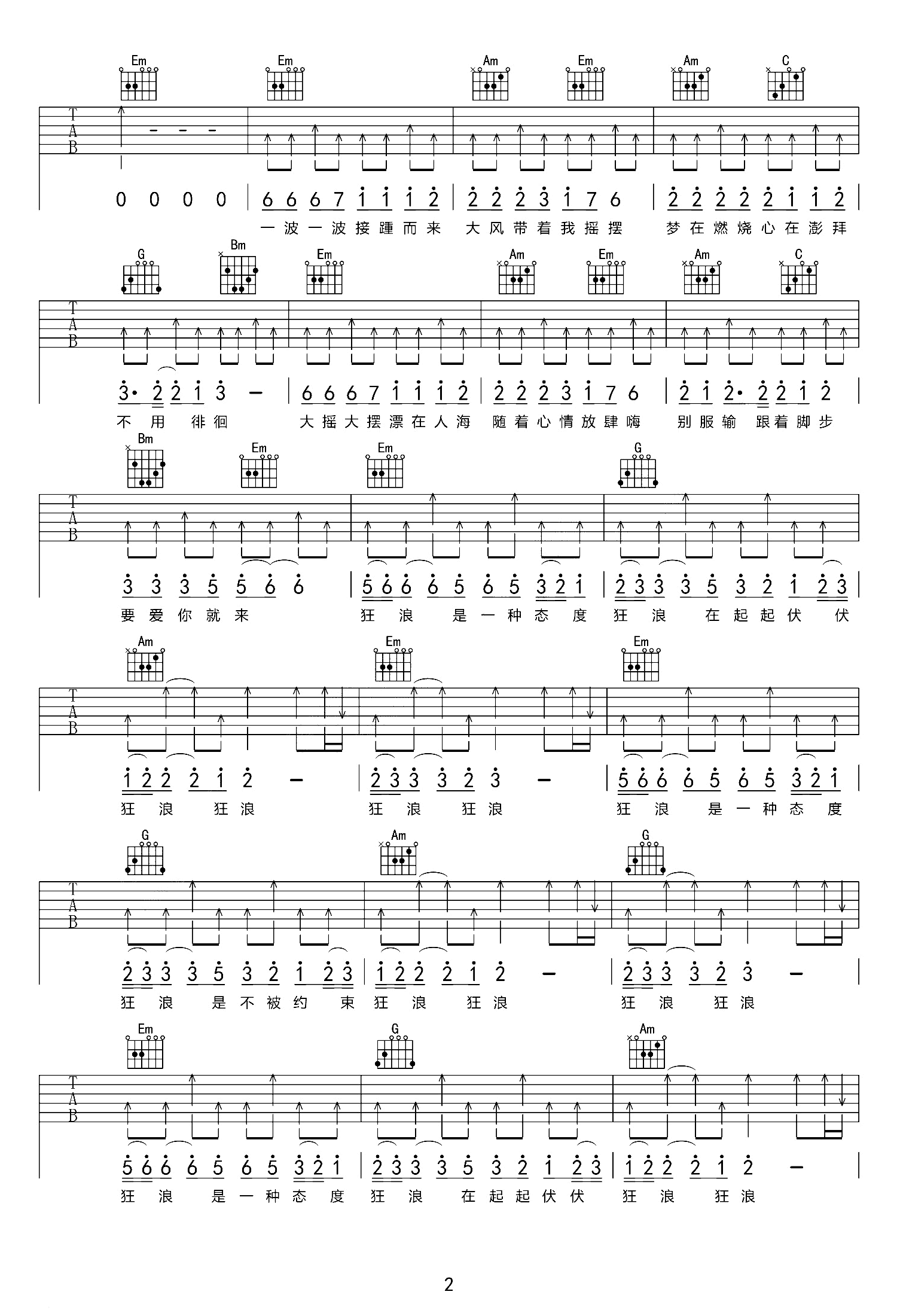 曲谱介绍: 花姐《狂狼》吉他弹唱谱,采用B调指法编配,共有3张高清图谱。