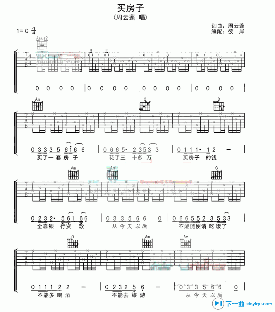 曲谱介绍: 周云蓬《买房子》吉他弹唱谱,采用C调指法编配,彼岸吉他编配出品,共有3张高清图谱。