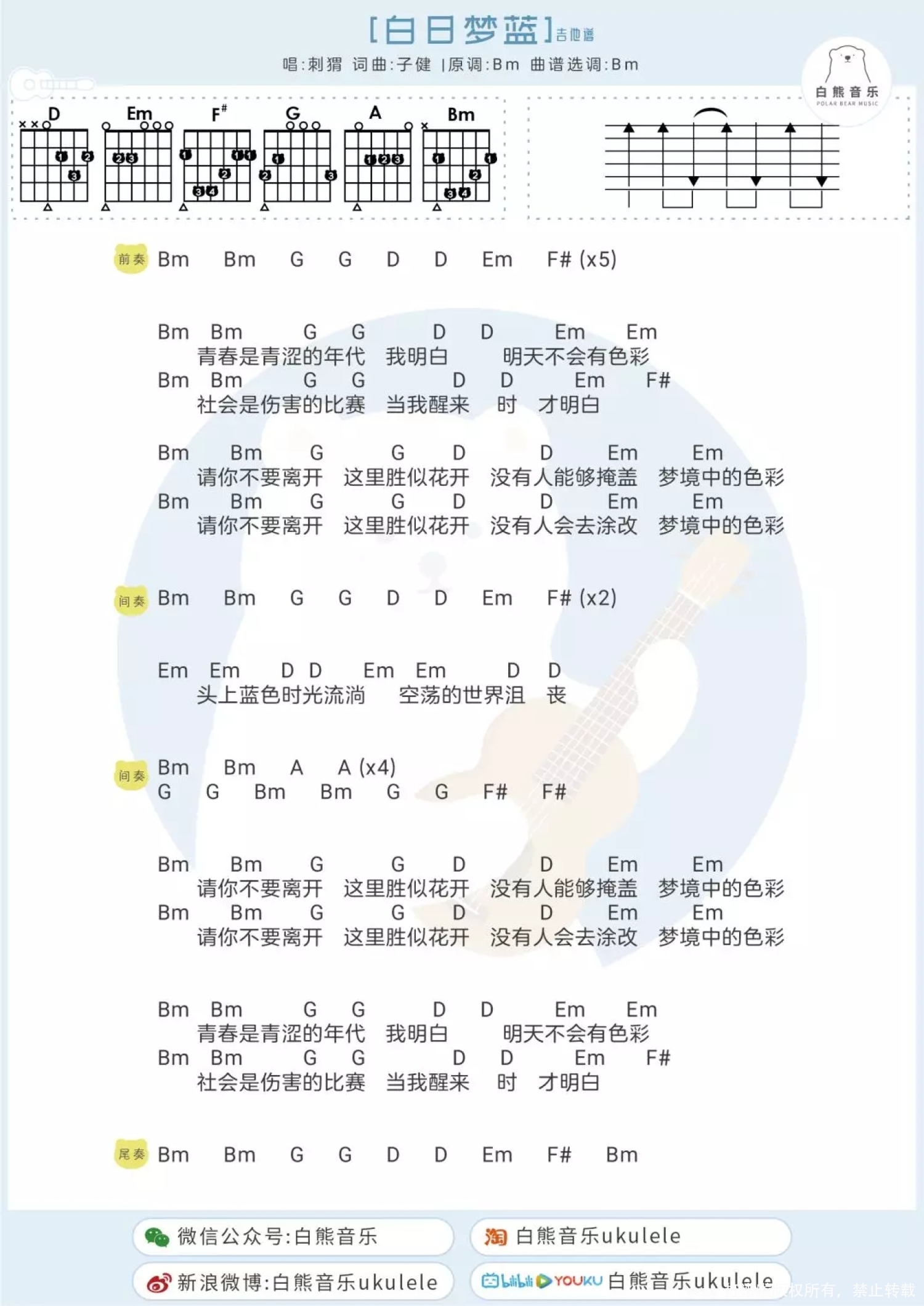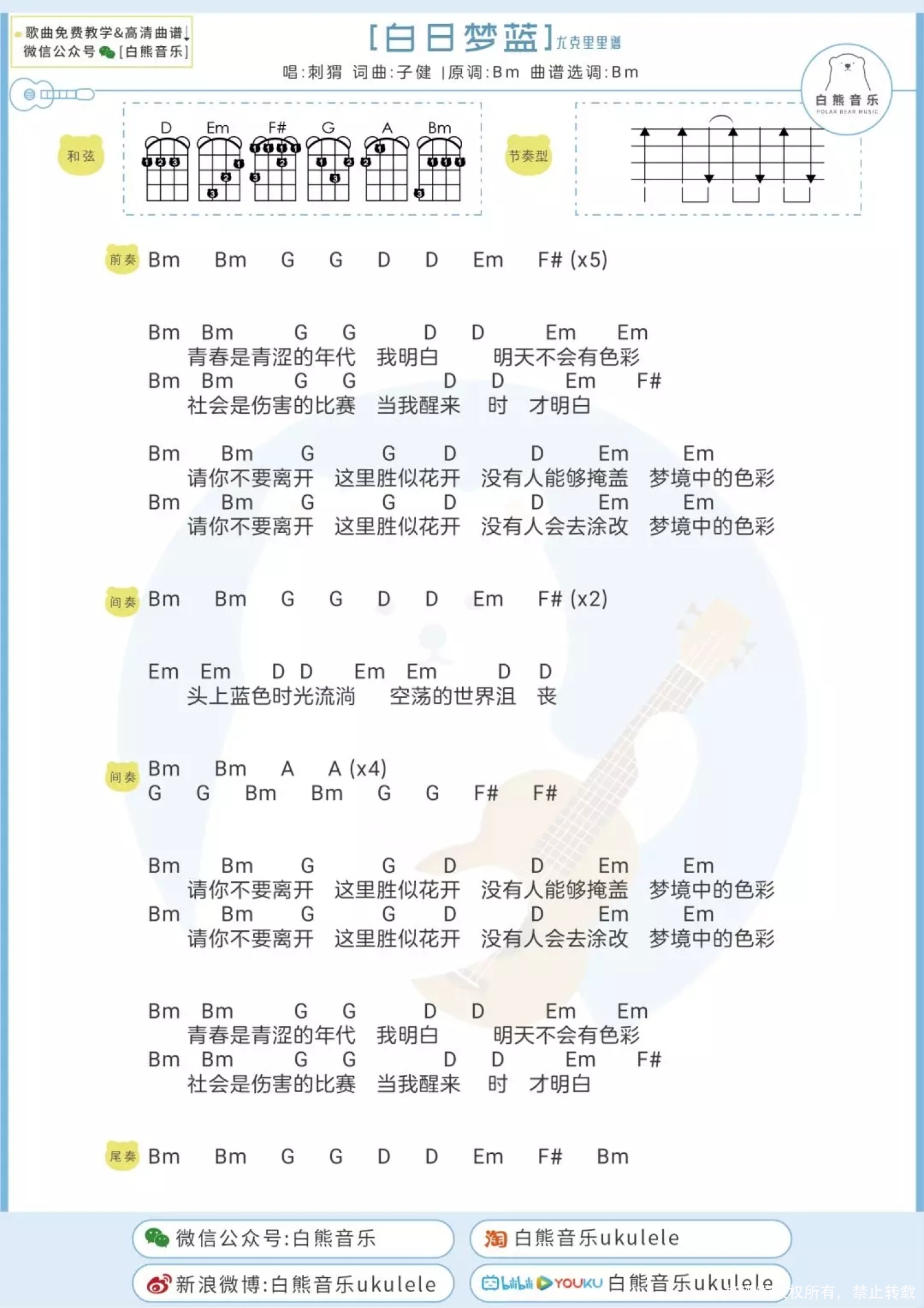 白日梦蓝尤克里里谱 - 刺猬乐队