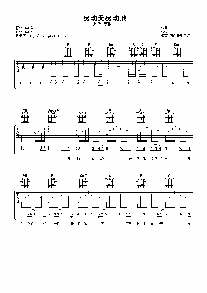 曲谱介绍: 宇桐非《感动天感动地》吉他弹唱谱,采用F调指法编配,阿潘音乐工场编配出品,共有3张高清图谱。