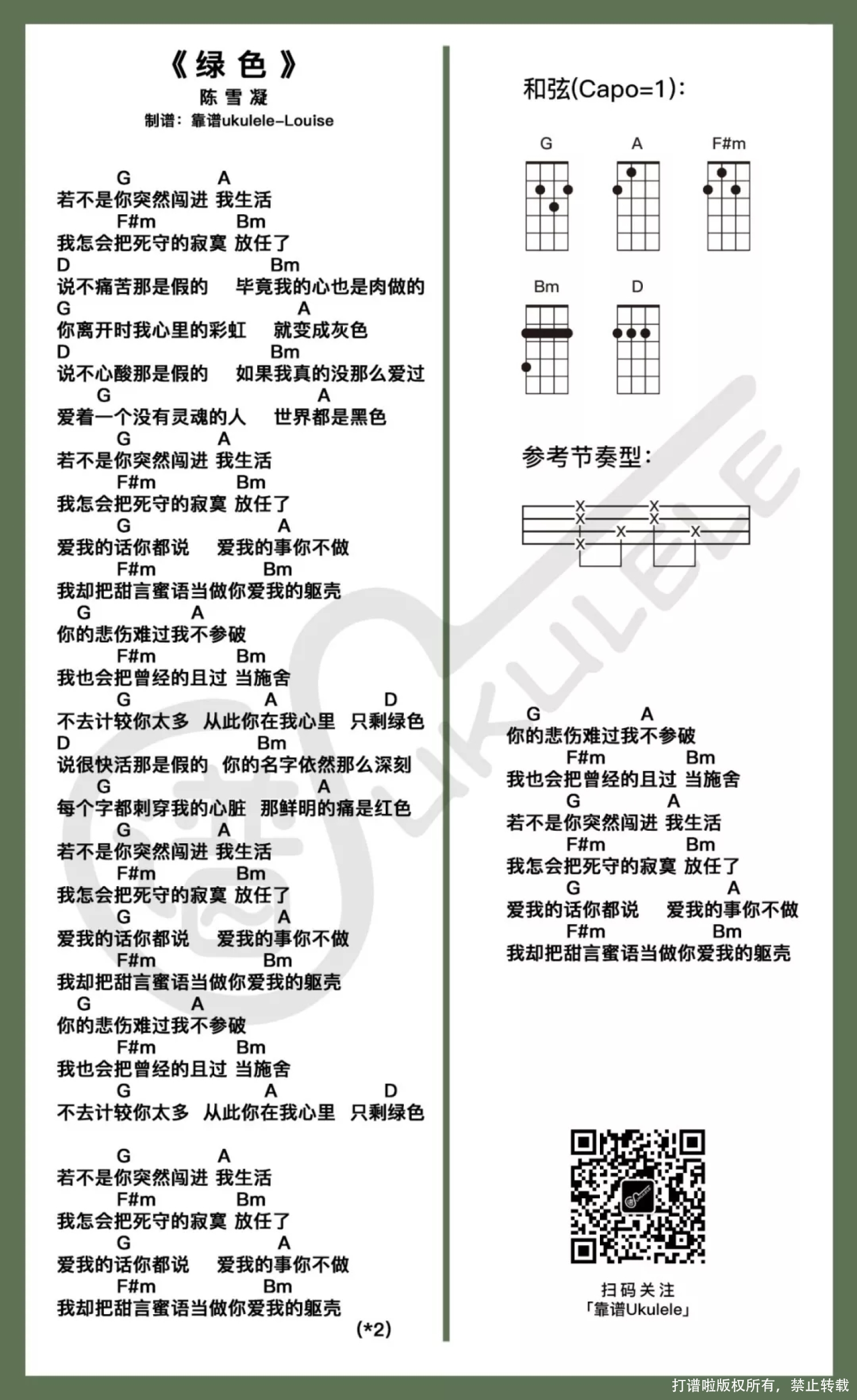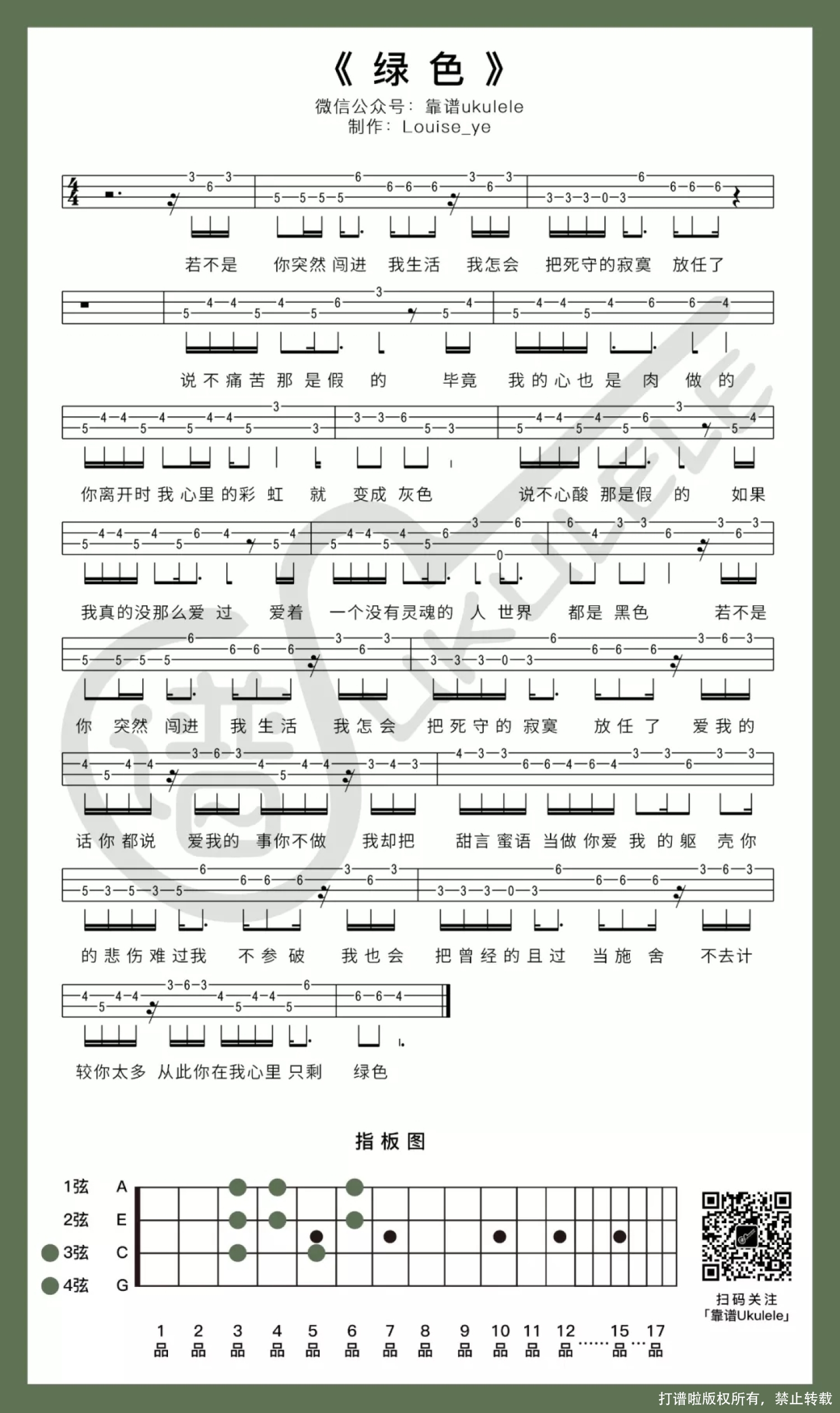 曲谱介绍: 这首《绿色》之前文末留言有被提到,并且收到的想要的曲谱信息中,也出现过几次……能说是2019年最火的歌曲之一? 这个通过网络红起来的歌手是怎样的一个女孩? 作为一名00后的创作歌手,受欢迎的程度到底有多少?作为普通听众,其实没有什么真实的感受……个人觉得她的作品还是相对小众范围,通过流行的短视频社交圈(大数据之类的……),不断被推送到了目标人群前,比起那些流行大咖而言,她要走的路还很远,毕竟总体来说还算是很嫩的新人。 有看到她作品中出现歌词抄袭嫌疑的消息?好像不仅仅是她,不少年轻的创作歌手在获得大众欢迎的同时都或多或少的出现类似情况,对于创作思路跟创作时的一些状况,我们其实是不了解的,也真的不能很客观角度去点评对错。只能叹一句原创不易呀……更是现在这样一个环境下…… 难度系数:★☆ 记得看谱之前注意一下变调夹的使用,变调夹夹在1品(Capo=1)。   绿色ukulele弹唱谱   当不知不觉已经习惯了一个人,对于孤独、对于社交、对于一个人处理这样那样的一些事,都有了不知道什么时候定下的游戏规则……本以为生活就这样继续的时候,却遇到了一个他……“若不是你突然闯进我生活,我怎会把死守的寂寞放任了”,会不会响起这样的一段旋律?…… “说不痛苦那是假的,毕竟我们的心也是肉做的……”。 是否有过喜欢上一个不那么在乎自己的人?因为他牵动自己的思绪,在自己的小宇宙中不受控……当有他陪伴时天是蓝的,彩虹是艳的……当迷失在他的世界,所有的颜色不再。一切变成过去后,不再因为他起波澜,内心变得平静时,就只剩下宁静的一抹绿…… 难度系数:★☆ 只是咋一看指板图的部分会不会想起我之前说的,判断简单与否的那些话?这首歌指法的部分可能会有些地方需要磨合,曲谱仅供参考,还是非常建议有兴趣的朋友自行尝试修改指法,把谱子变成自己更顺手的版本哦。 绿色ukulele指弹谱