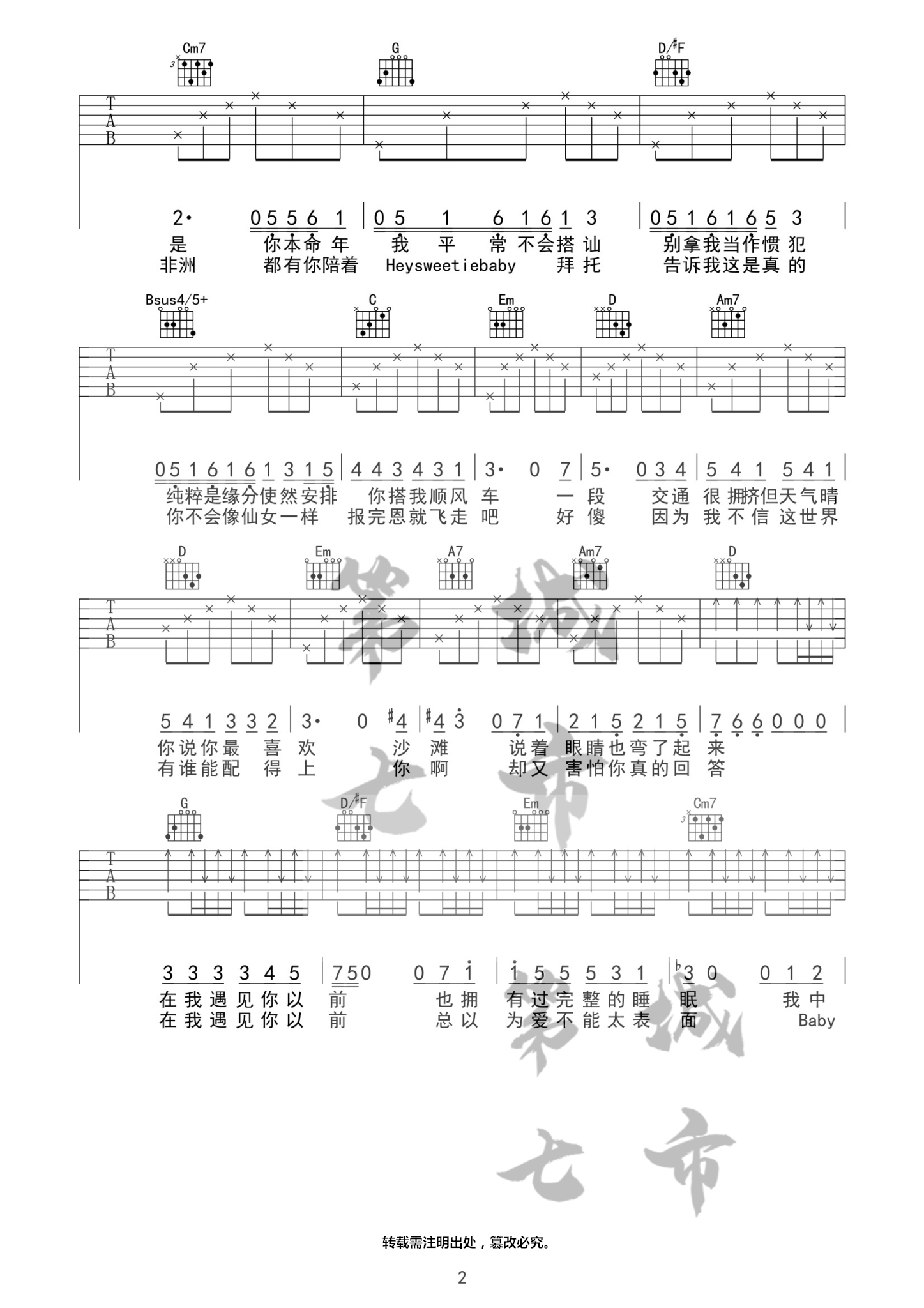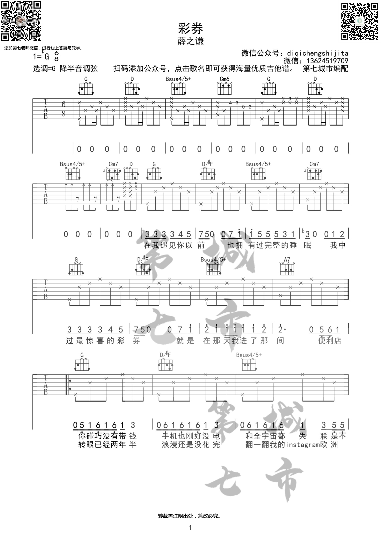 曲谱介绍: 薛之谦《彩券》吉他弹唱谱,采用G调指法编配,第七城市编配出品,共有3张高清图谱。